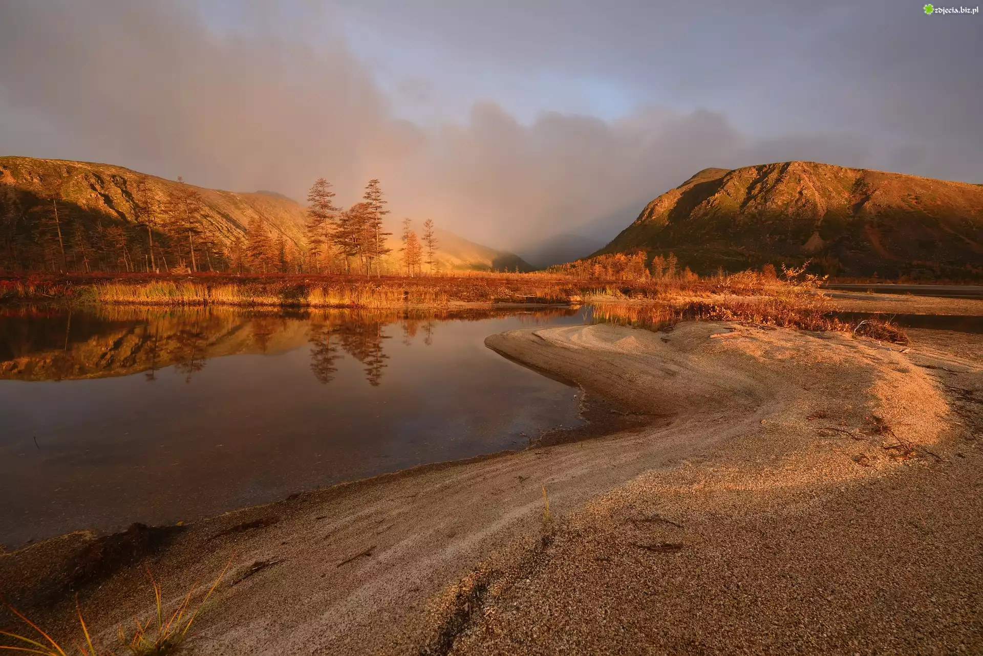 Zdjęcie Góry, Rzeka Purga, Drzewa, Mgła, Jesień, Kołyma, Obwód magadański, Rosja