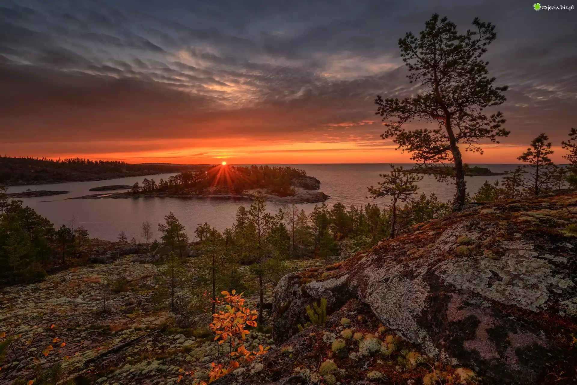 Zdjęcie Rosja, Karelia, Jezioro, Ładoga, Skały, Drzewa, Niebo, Zachód słońca