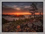 Zdjęcie, Rosja, Karelia, Jezioro, Ładoga, Skały, Drzewa, Niebo, Zachód słońca
