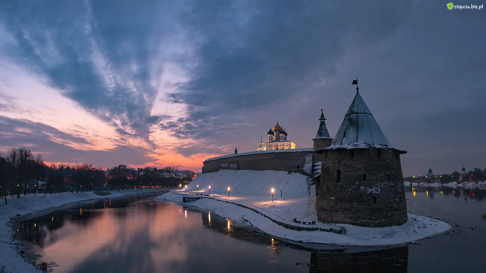 Zdjęcie Rosja, Obwód pskowski, Psków, Wieża, Twierdza, Pskov Kremlin, Rzeka Velikaya, Zachód słońca, Chmury, Śnieg, Światła |