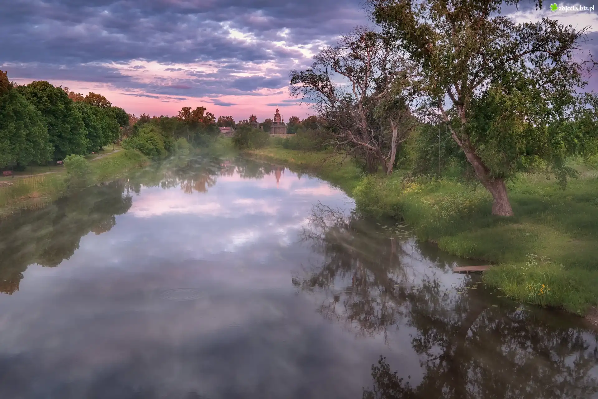 Zdjęcie Drzewa, Rzeka Kamienka, Wschód słońca, Cerkiew, Suzdal, Obwód włodzimierski, Rosja