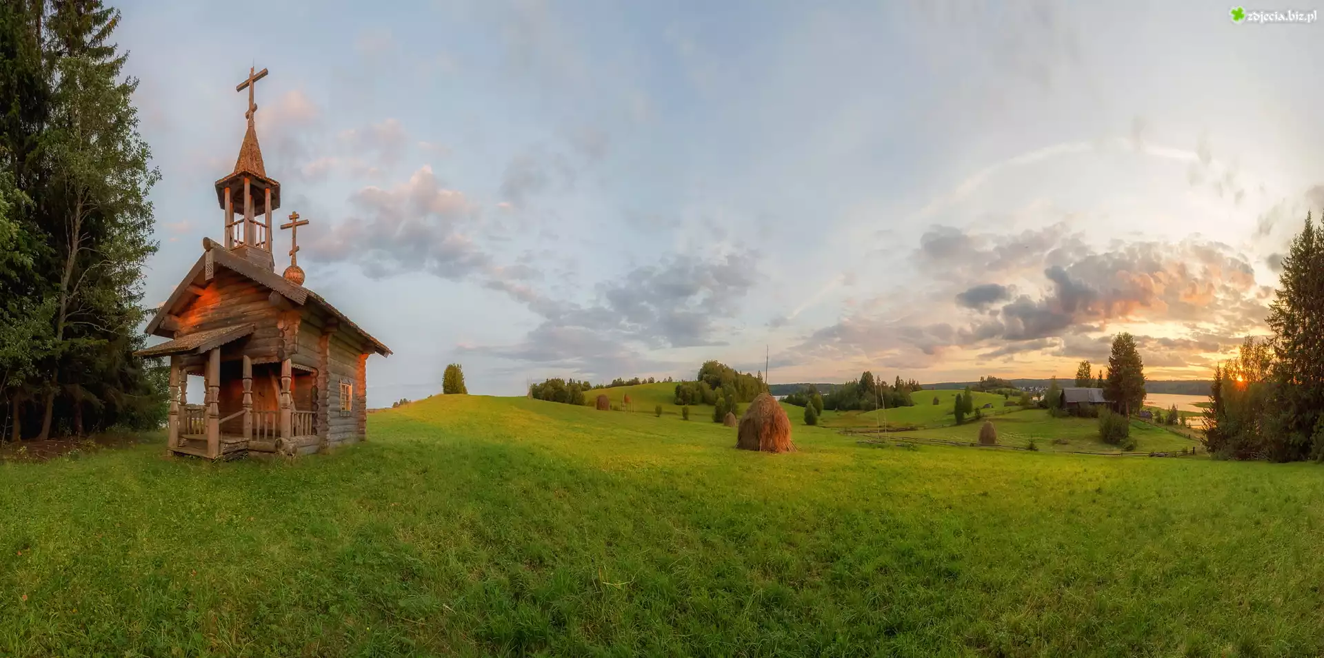 Zdjęcie Wieś, Kienoziero, Kaplica, Pola, Stogi, Siana, Lato, Obwód archangielski, Rosja