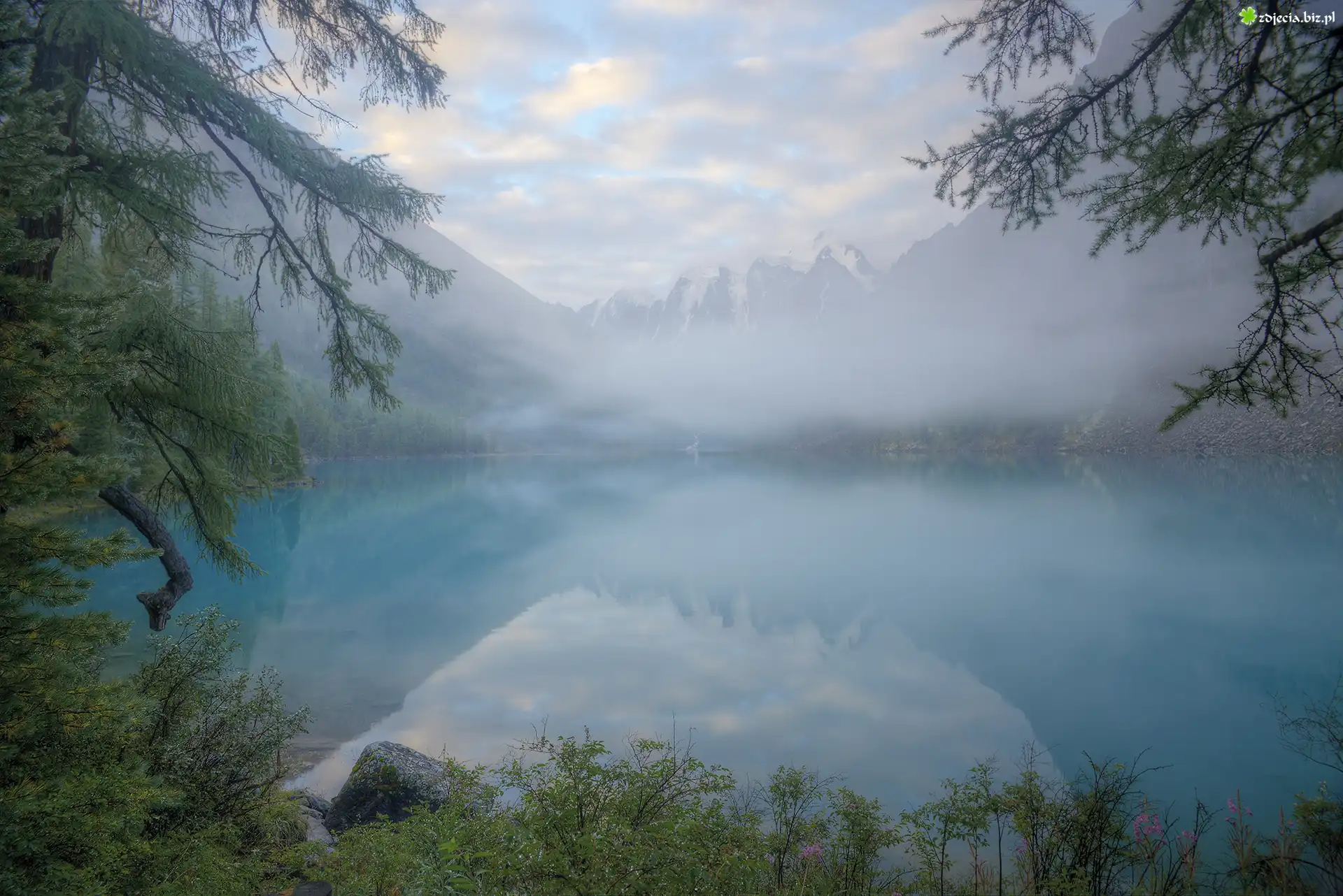 Zdjęcie Góry, Jezioro Szawlińskie, Mgła, Gałązki, Drzew, Republika Ałtaju, Rosja