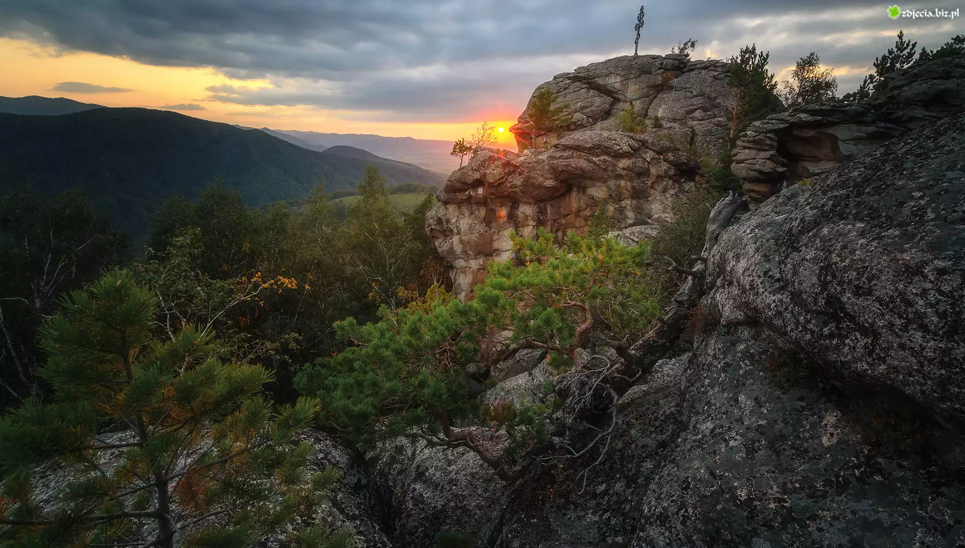 Zdjęcie Skały, Góry Ałtaj, Drzewa, Wschód słońca, Biełokuricha, Kraj Ałtajski, Rosja