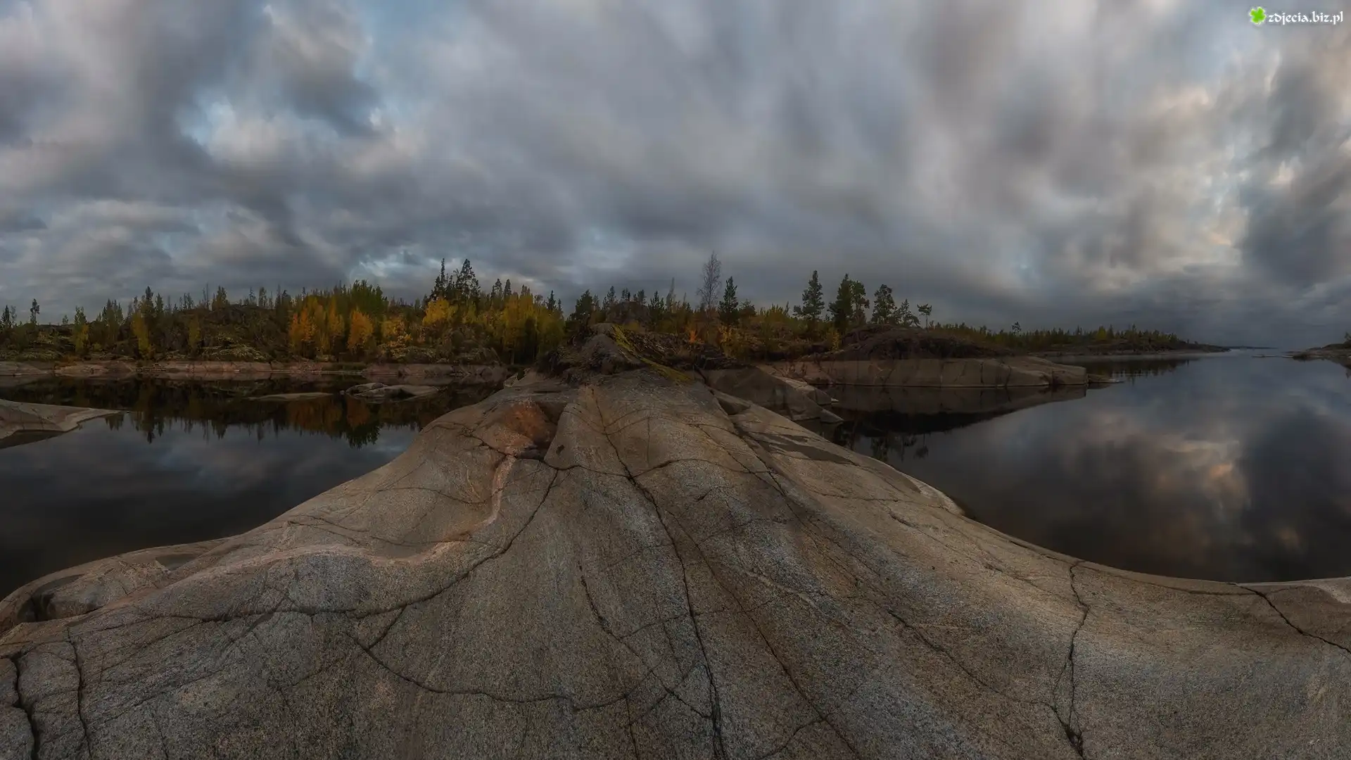 Zdjęcie Jezioro Ładoga, Wysepki, Skały, Drzewa, Chmury, Republika Karelii, Rosja