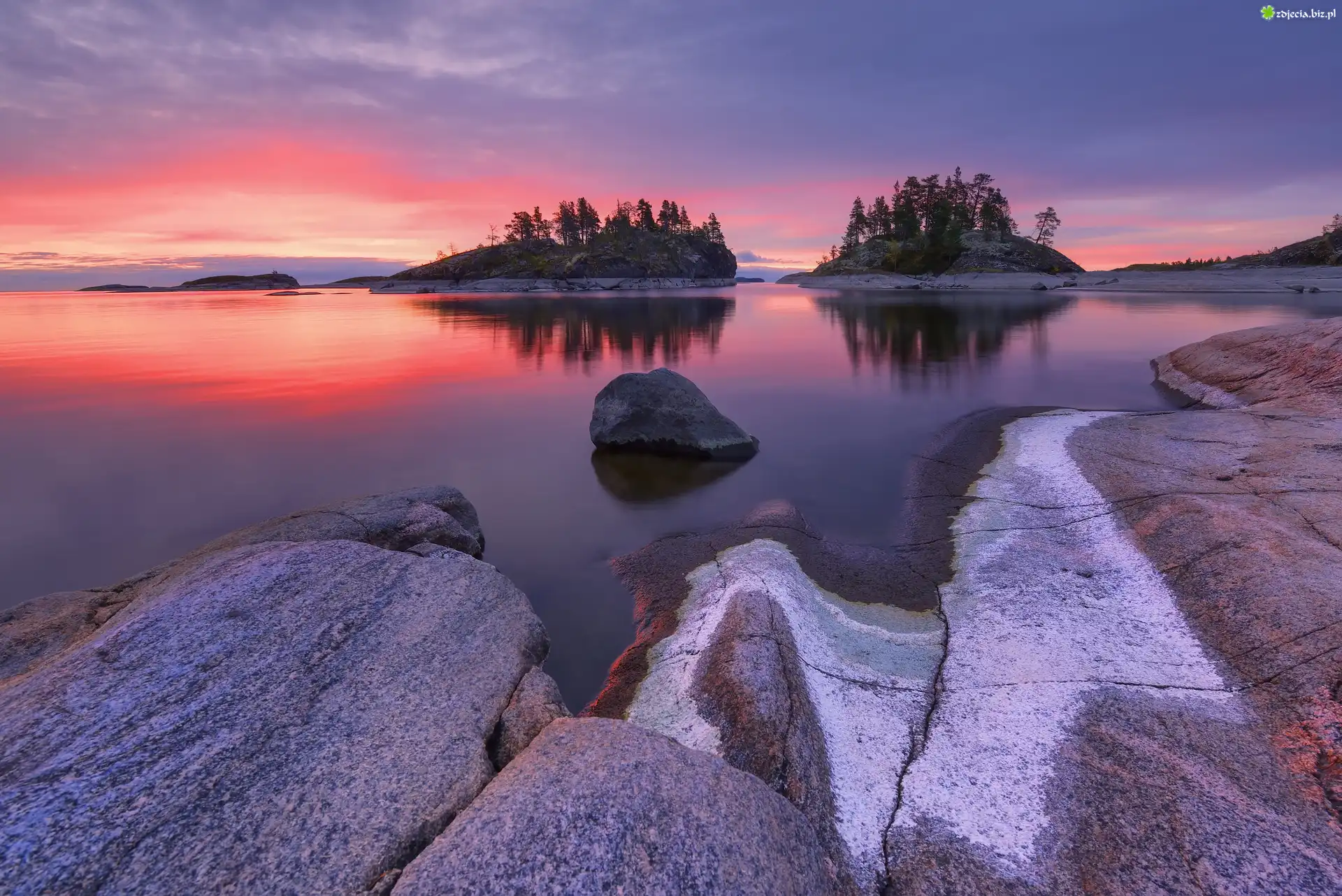Zdjęcie, Wschód słońca, Skały, Drzewa, Wysepki, Kamień, Jezioro Ładoga, Karelia, Rosja