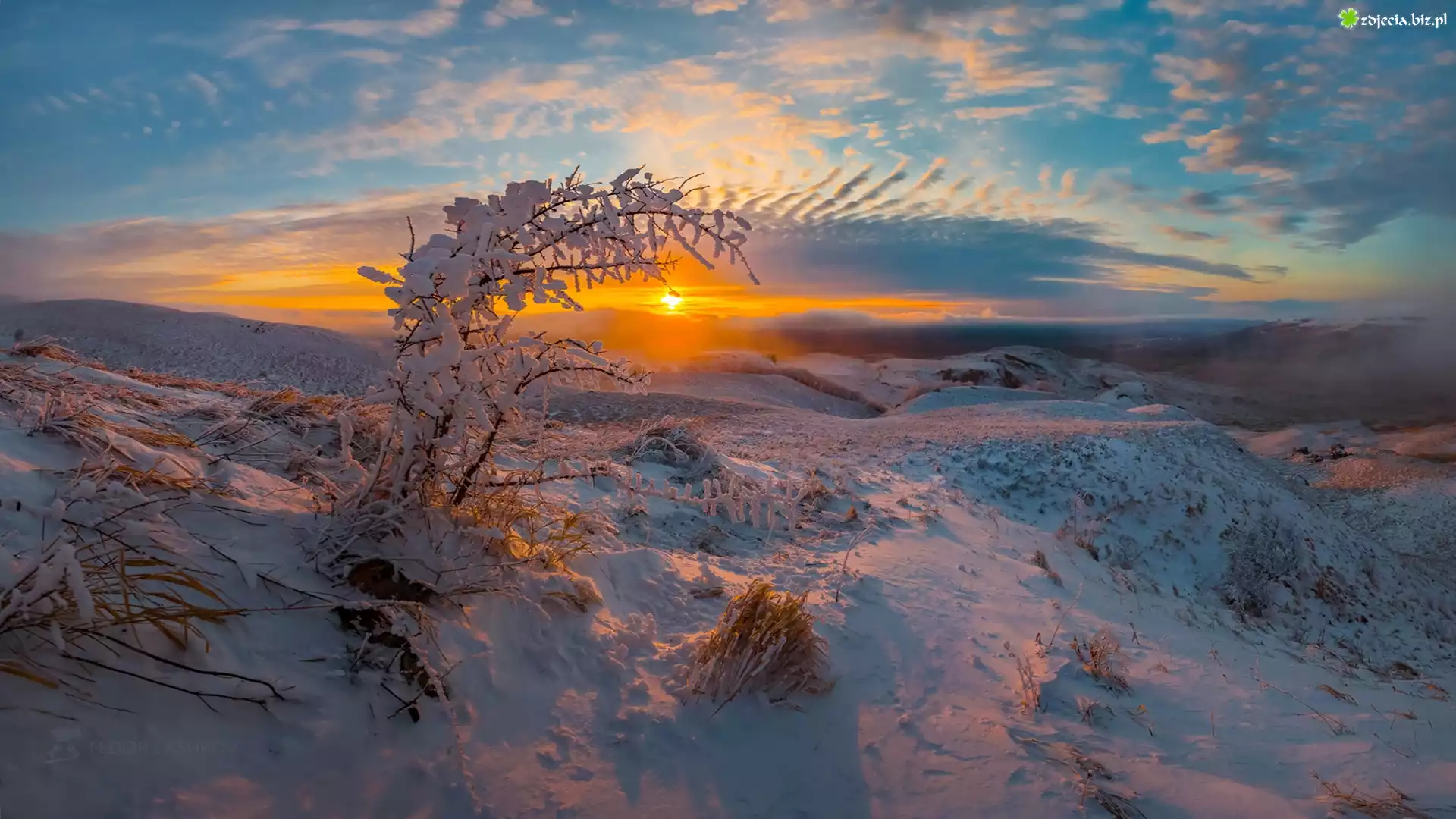 Zdjęcie Zima, Wierzchołek, Góra Strizhament, Wzgórza, Ośnieżona, Roślinność, Zachód słońca, Rosja
