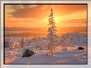Zdjęcie, Rosja, Półwysep Kolski, Zima, Ośnieżone, Drzewa, Zachód słońca, Kamienie