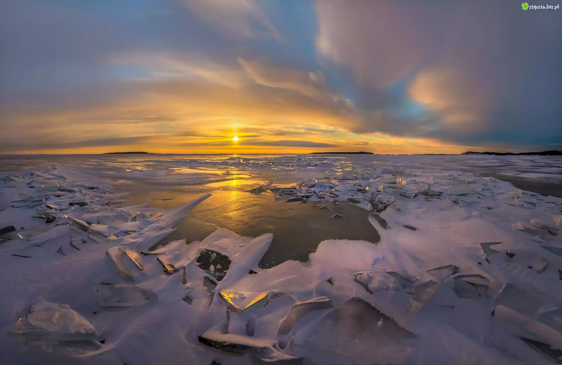 Zdjęcie Jezioro Ładoga, Zima, Lód, Wschód słońca, Chmury, Karelia, Rosja