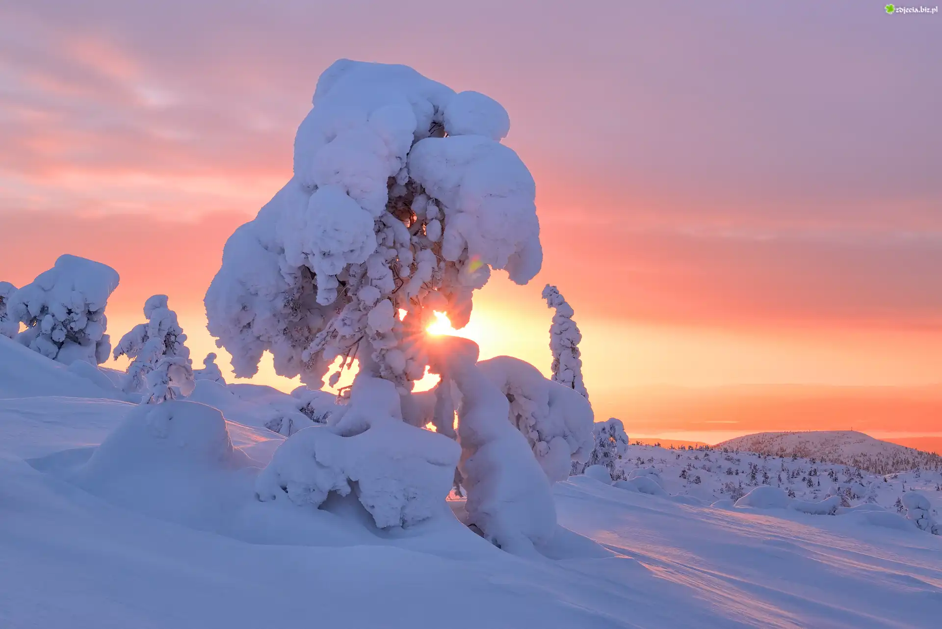 Zdjęcie, Wschód słońca, Zima, Śnieg, Drzewa, Kandałaksza, Obwód murmański, Rosja