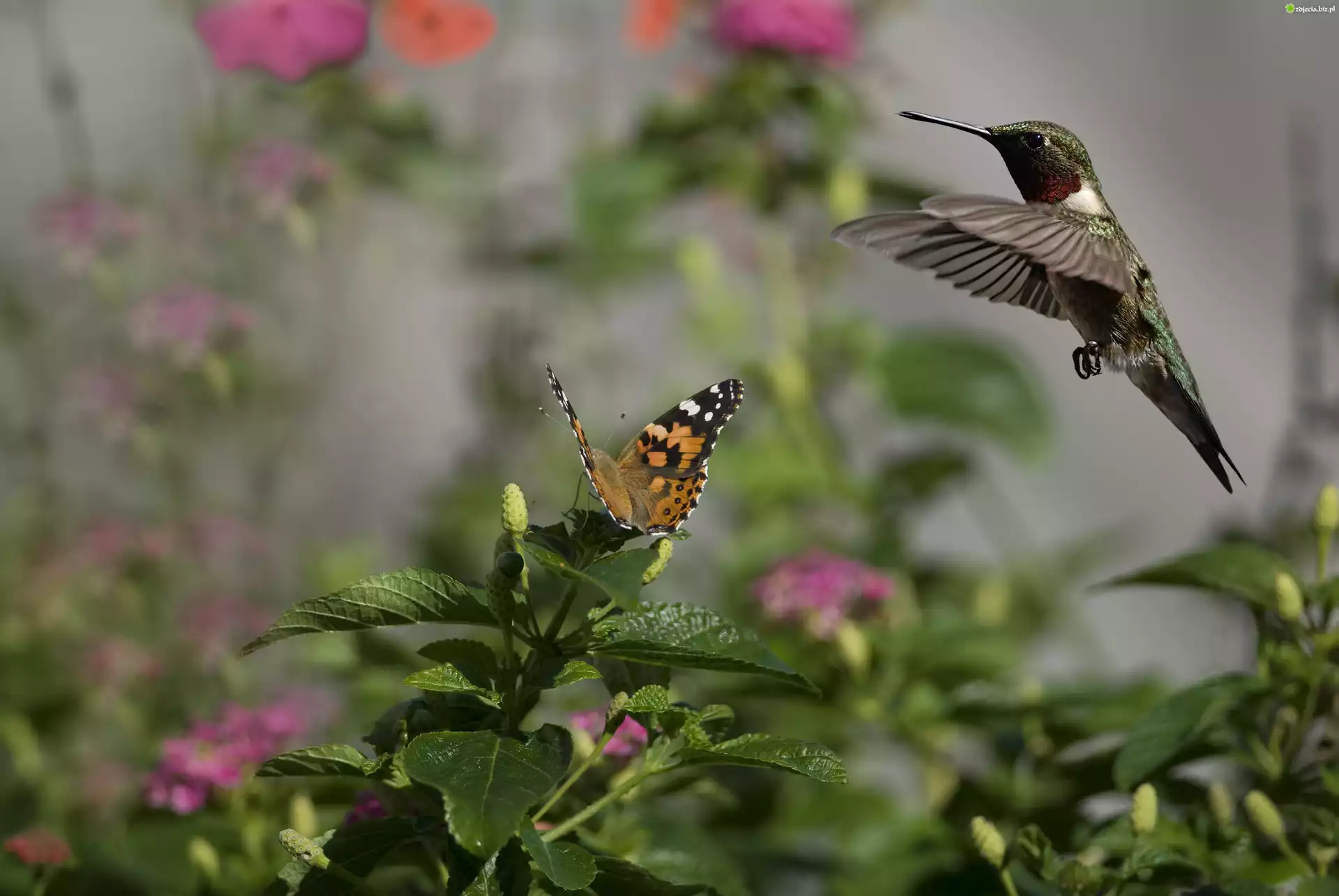 Zdjęcie, Roślina, Liście, Motyl, Ptak, Koliber