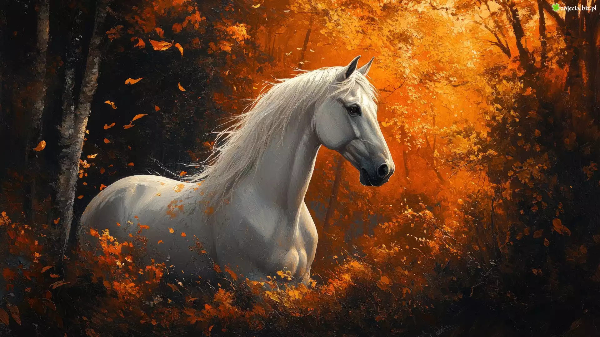 Zdjęcie Koń, Siwy, Drzewa, Roślinność, Jesień, Grafika AI