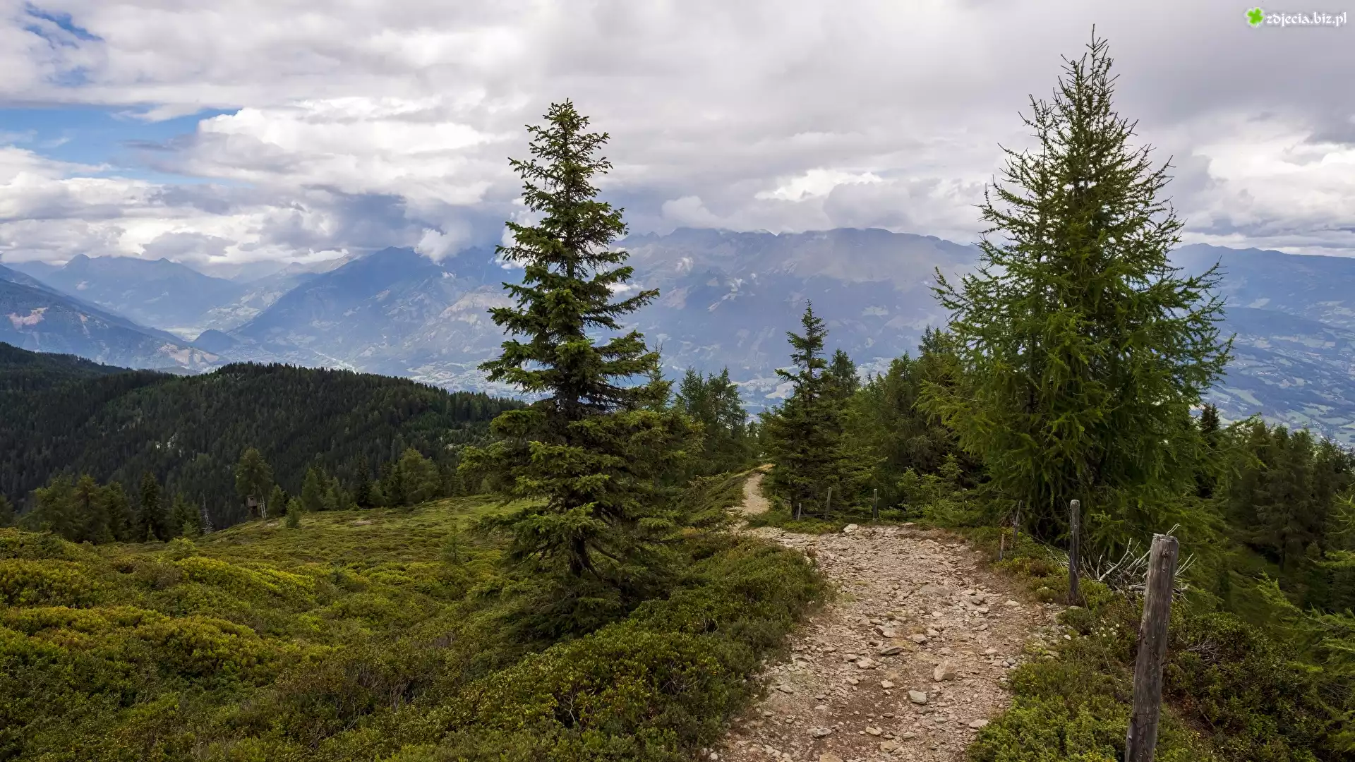 Zdjęcie Góry Himalaje, Lasy, Ścieżka, Świerki, Roślinność, Chmury, Miejscowość Śrinagar, Stan Uttarakhand, Indie |