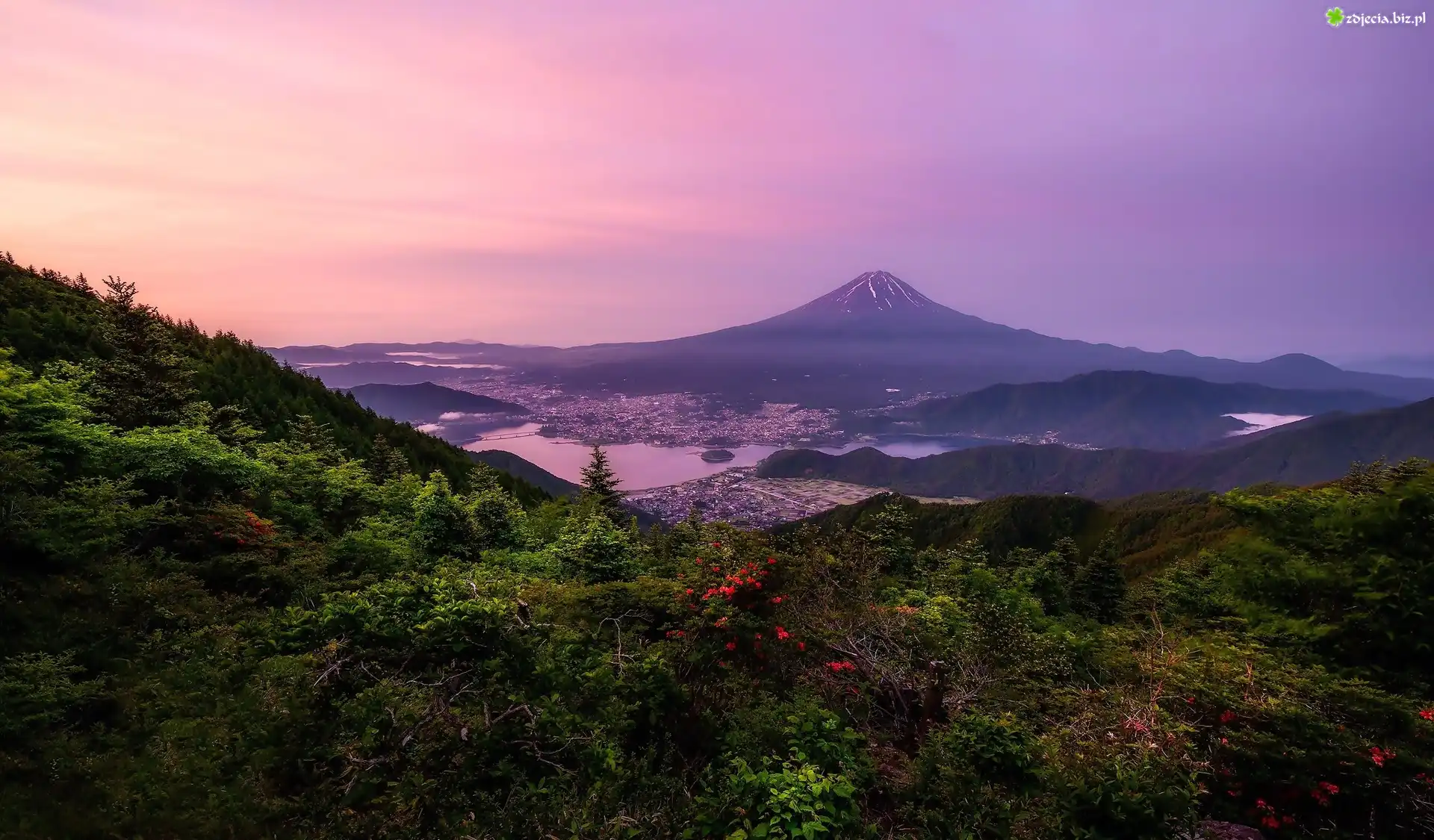 Zdjęcie, Japonia, Wyspa Honsiu, Góra, Stratowulkan Fudżi, Zachód słońca, Roślinność