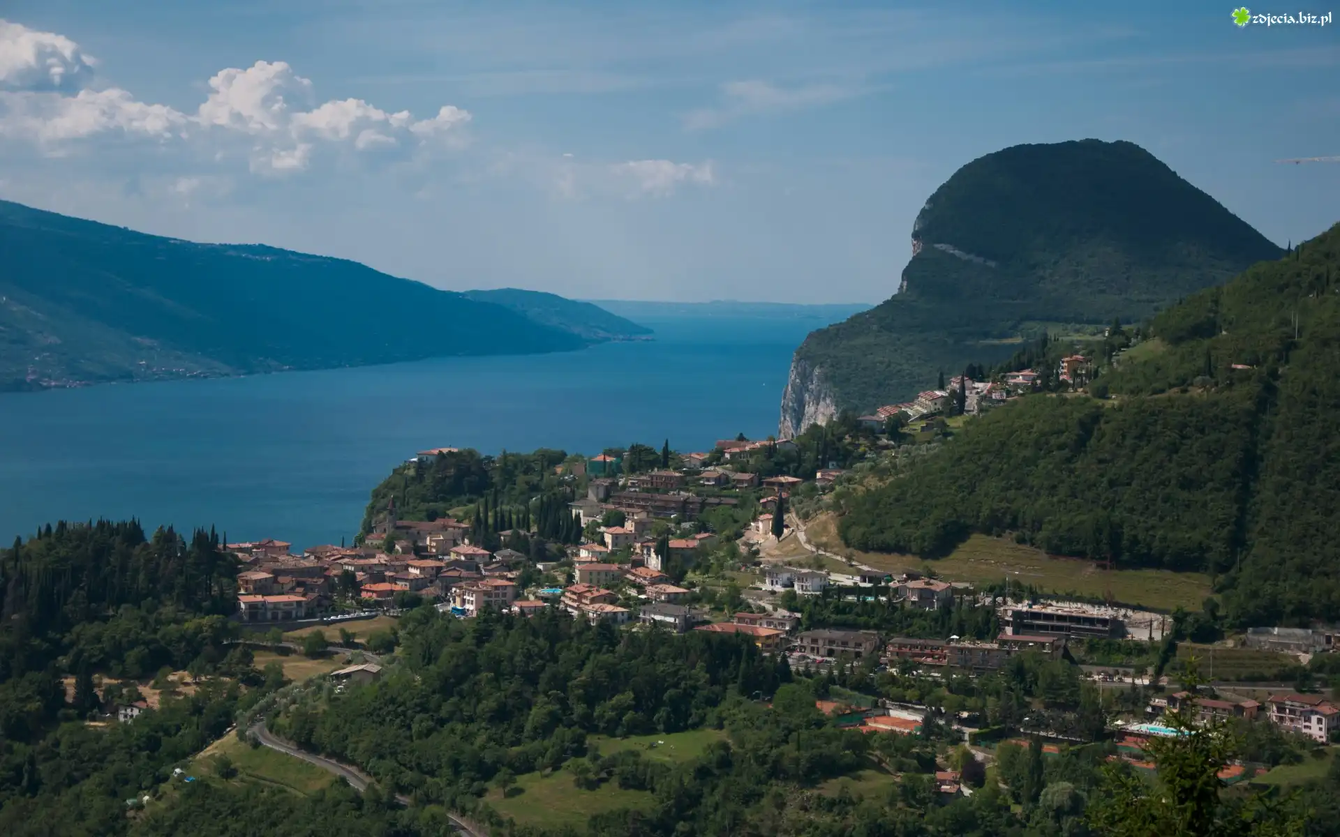 Zdjęcie Włochy, Jezioro Garda, Góry, Lasy, Drzewa, Miasteczko, Domy, Niebo, Roślinność
