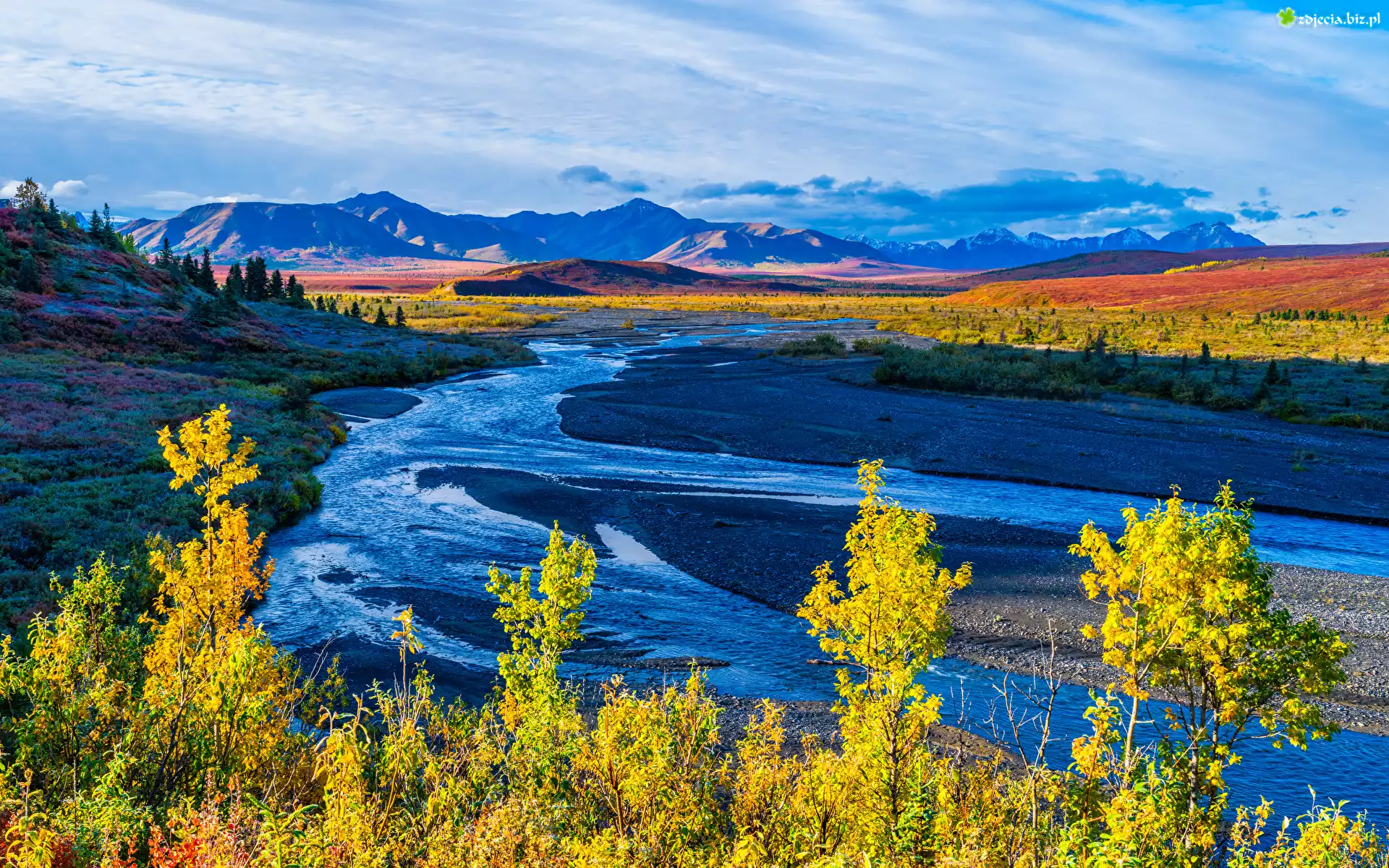 Zdjęcie Park Narodowy Denali, Góry, Rzeka, Savage River, Drzewa, Roślinność, Jesień, Niebo, Alaska, Stany Zjednoczone |