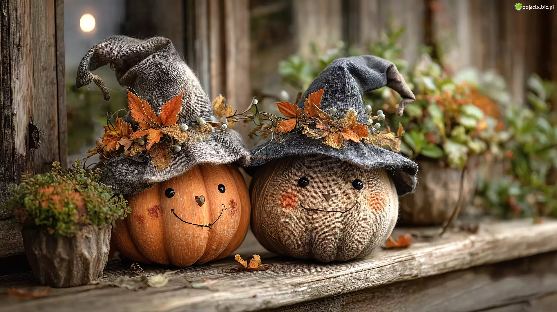 Zdjęcie, Dynie, Kapelusze, Liście, Rośliny, Grafika AI