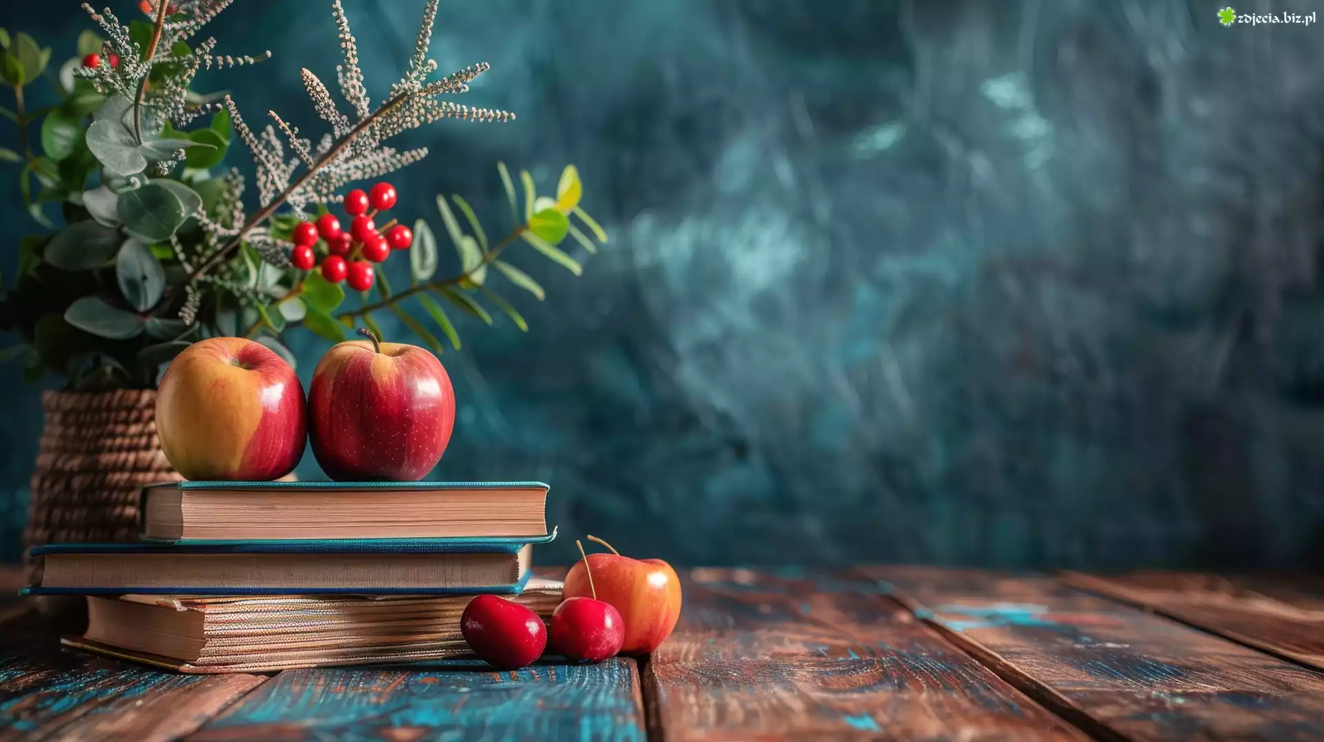 Zdjęcie, Książki, Jabłka, Wazon, Rośliny, Grafika AI
