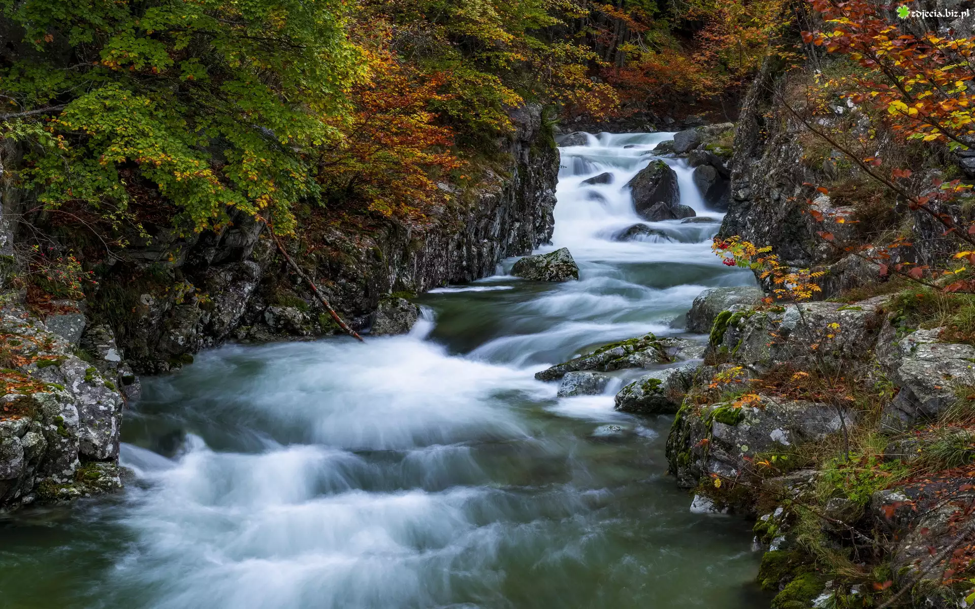 Zdjęcie, Jesień, Las, Drzewa, Gałęzie, Rzeka, Skały, Kamienie, Rośliny