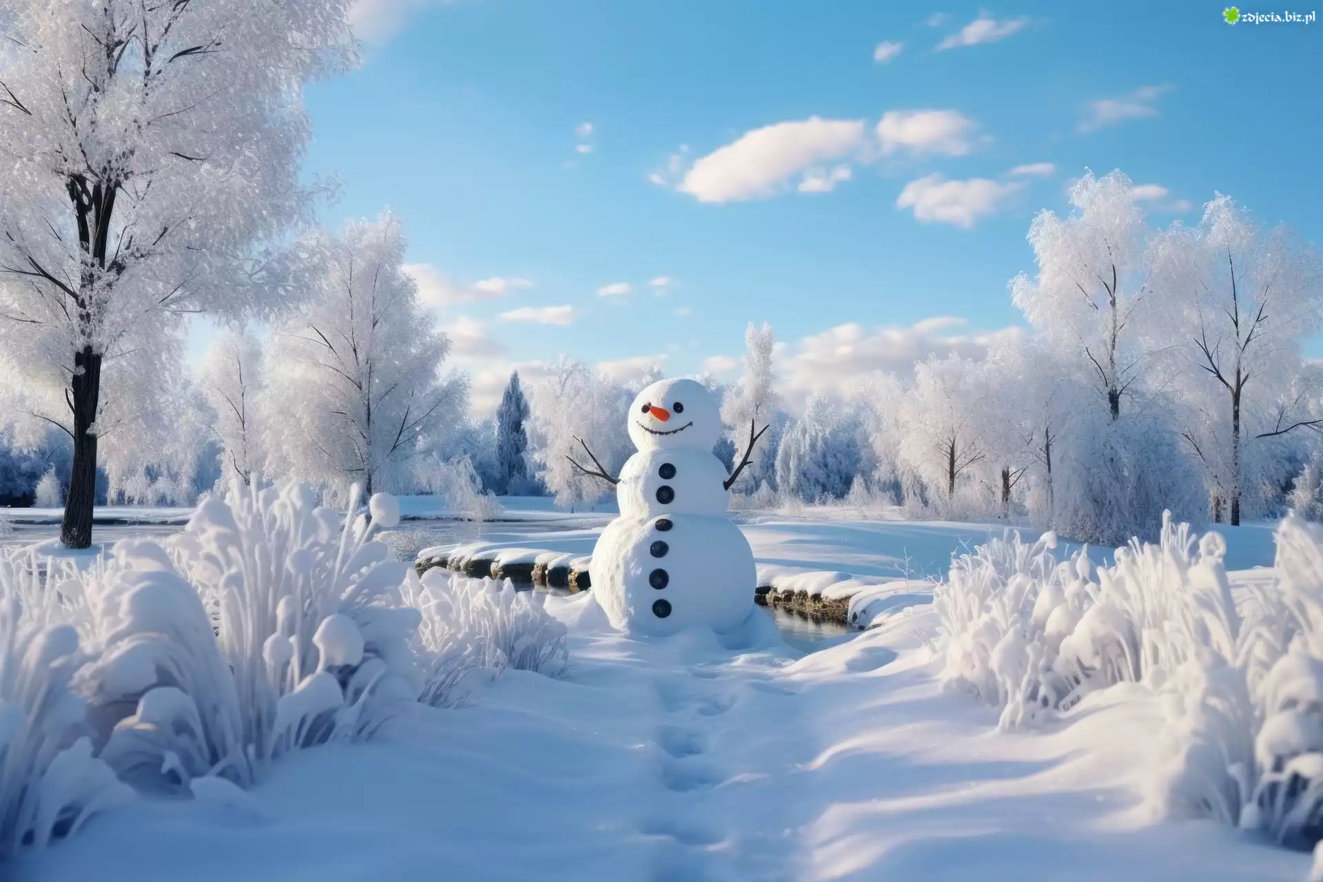 Zdjęcie Zima, Bałwan, Oszronione, Rośliny, Drzewa, Grafika