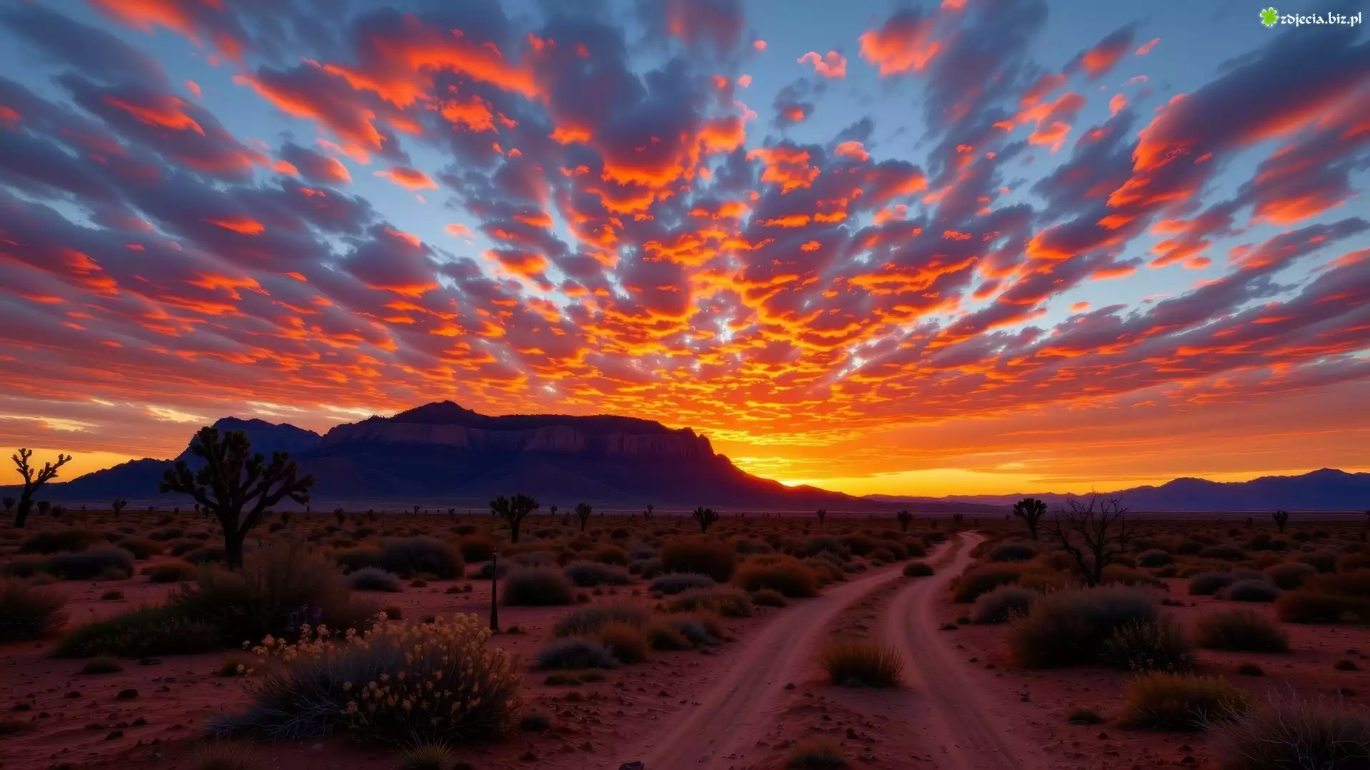 Zdjęcie Zachód słońca, Kolorowe, Niebo, Chmury, Góry, Droga, Rośliny