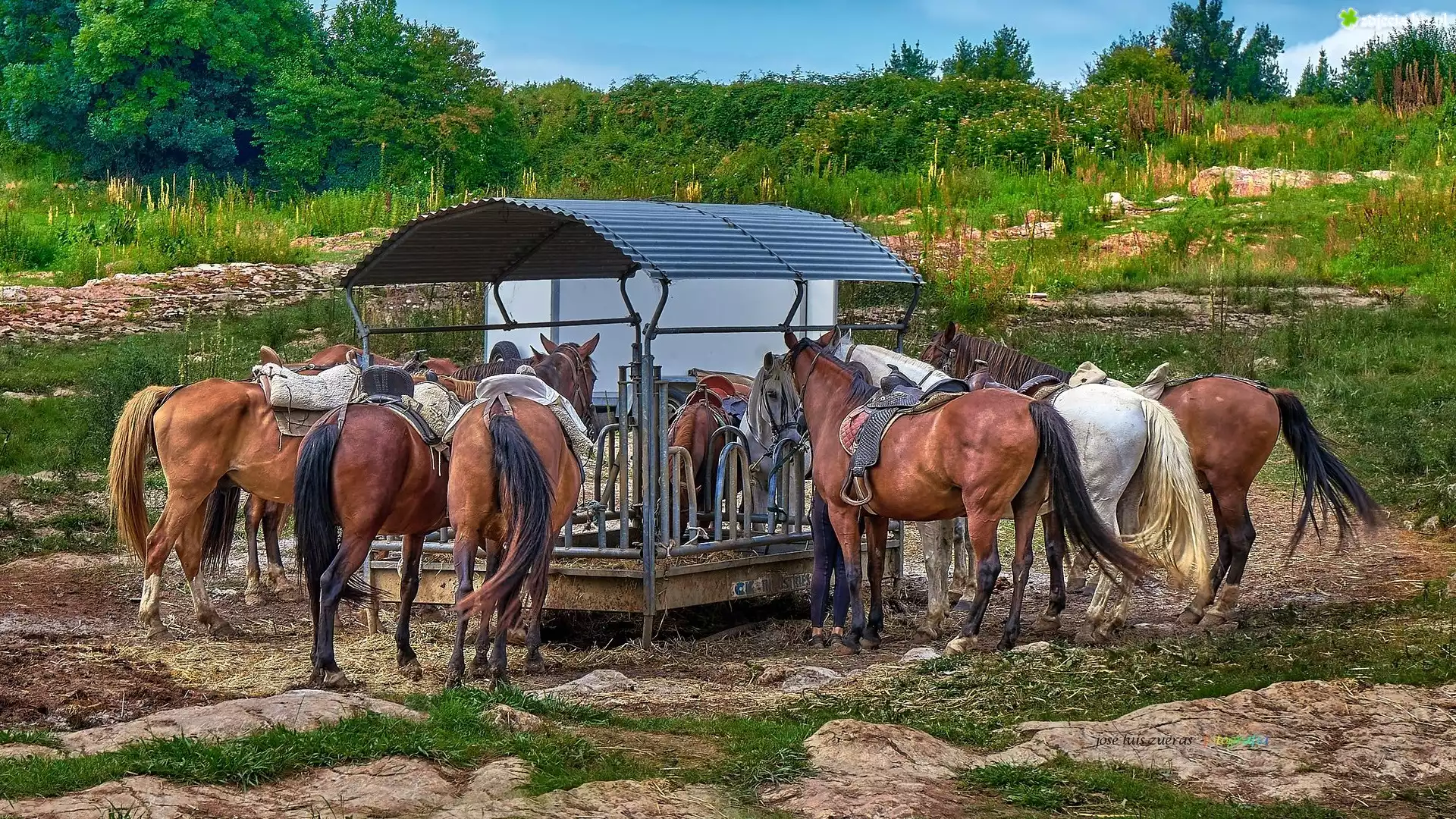 Zdjęcie, Konie, Zadaszenie, Drzewa, Rośliny