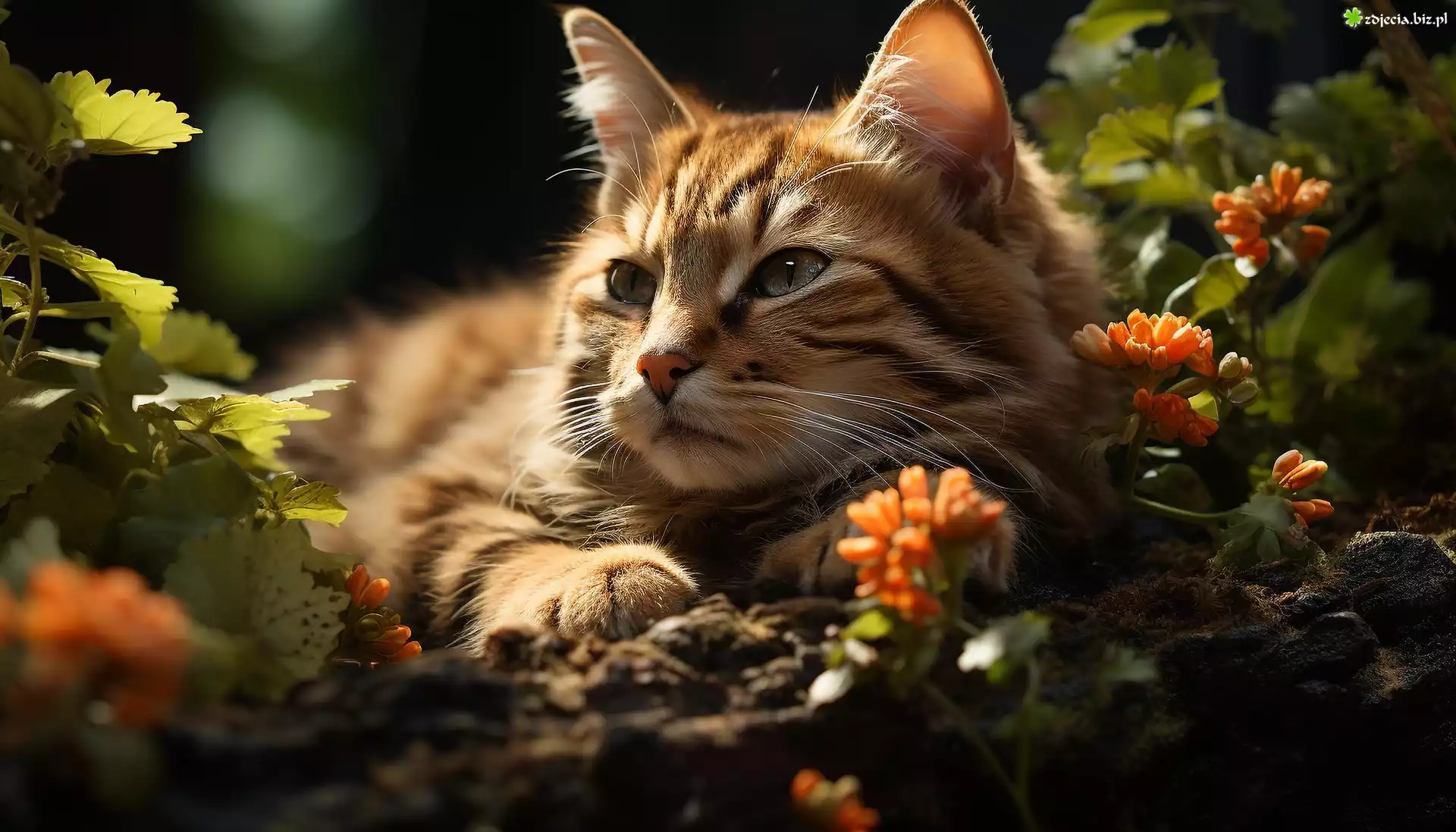 Zdjęcie Kot, Spojrzenie, Kwiaty, Rośliny