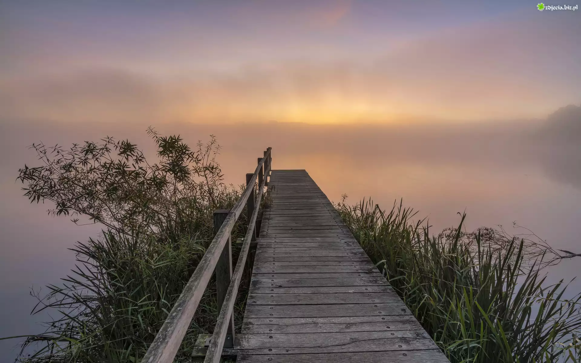 Zdjęcie Jezioro, Drewniany, Pomost, Rośliny, Gęsta, Mgła