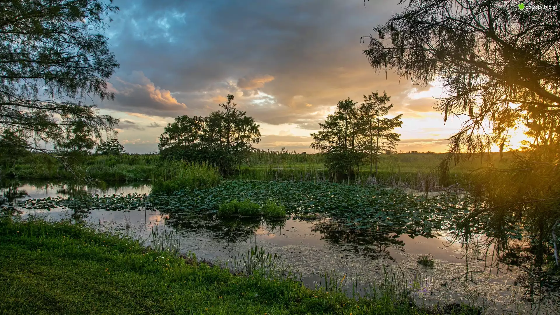 Zdjęcie Staw, Drzewa, Trawa, Rośliny, Zachód słońca