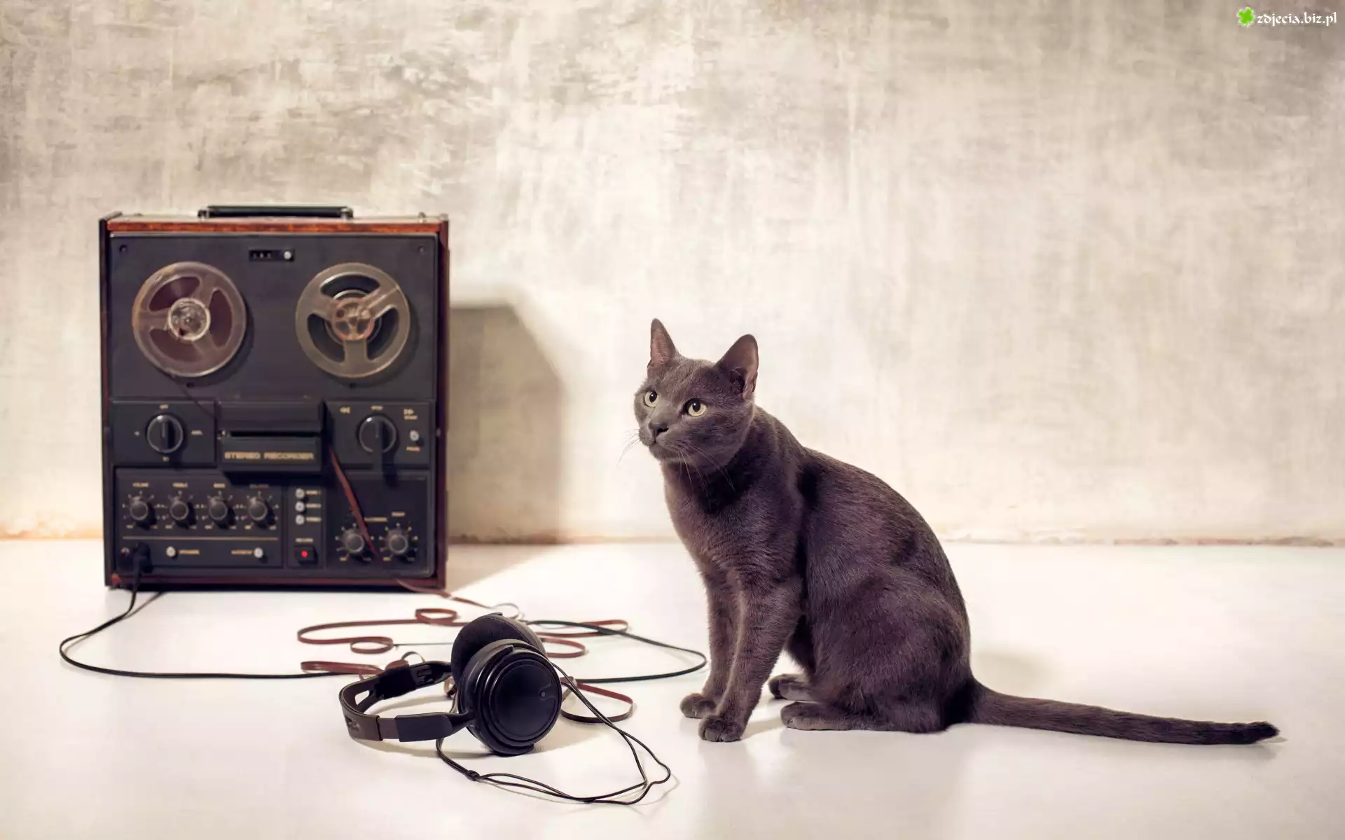 Zdjęcie, Kot rosyjski niebieski, Meloman, Słuchawki, Wąsy, Magnetofon szpulowy