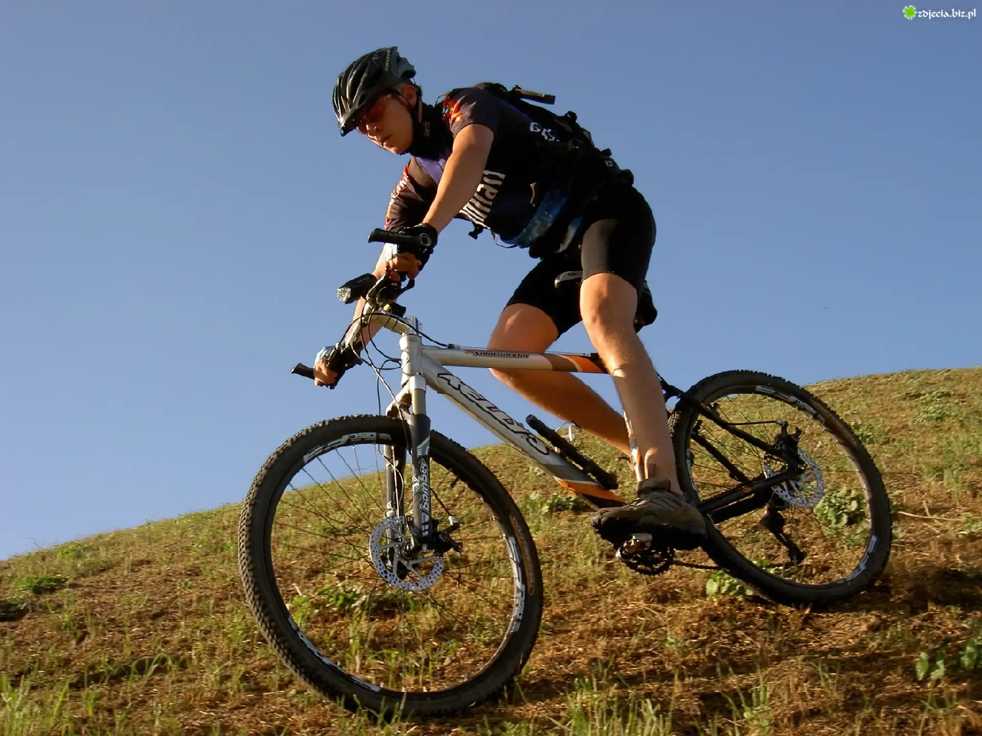 Zdjęcie, Rower,koło , kierownica, kask ,rowerzysta