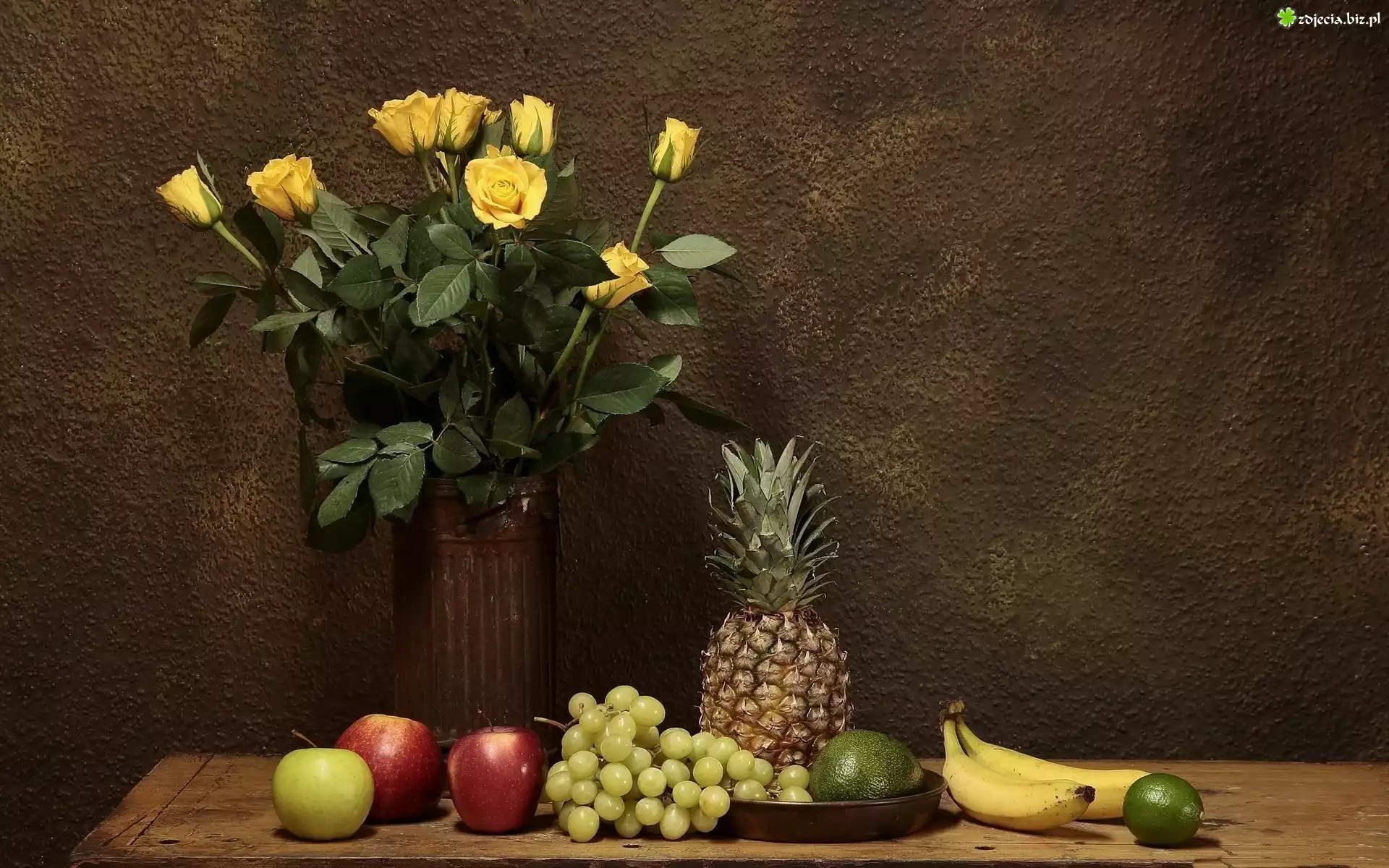 Zdjęcie Bukiet, Róż, Ananas, Winogrona, Jabłka, Banany, Limonka, Owoce