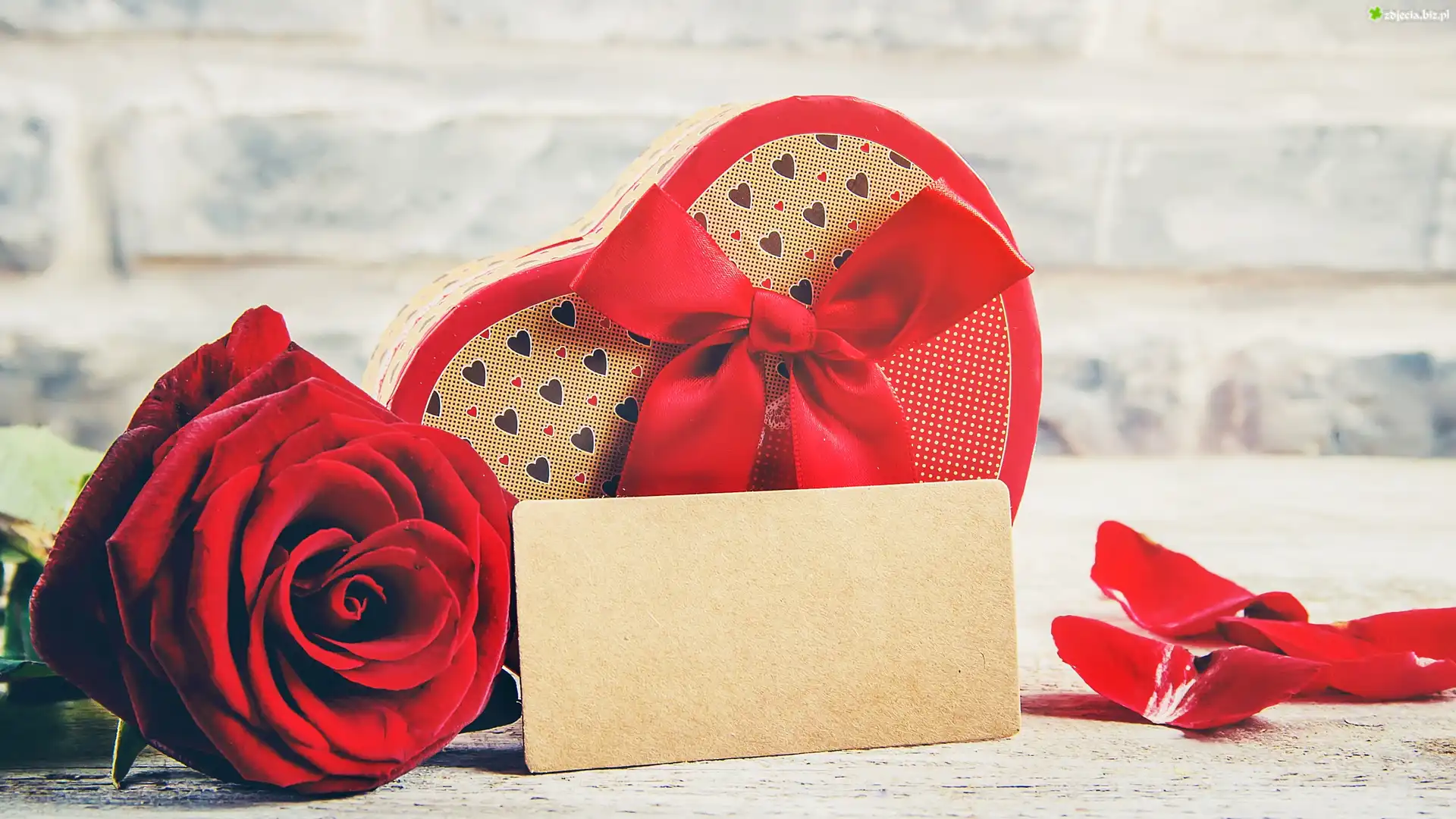 Zdjęcie Czerwona, Róża, Pudełko, Wstążka, Czekoladki, Serce, Karteczka, Walentynki