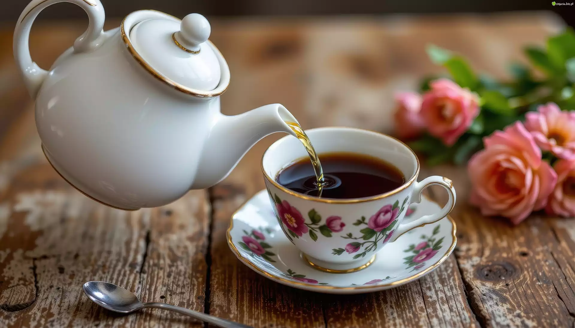 Zdjęcie Czajnik, Filiżanka, Herbata, Róże