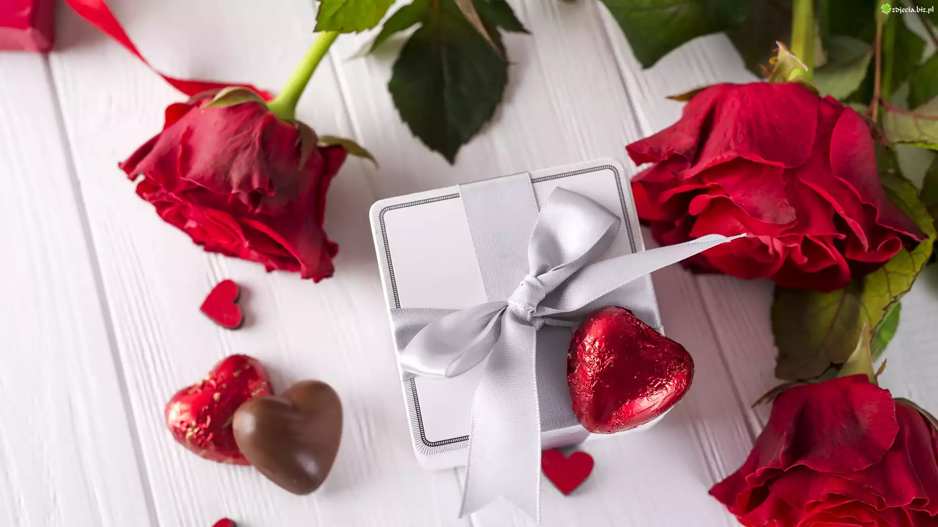 Zdjęcie Róże, Prezent, Serduszka, Czekoladki, Walentynki