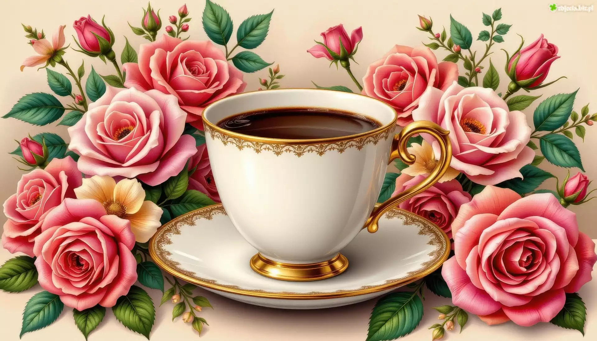 Zdjęcie Filiżanka, Talerzyk, Kawa, Róże