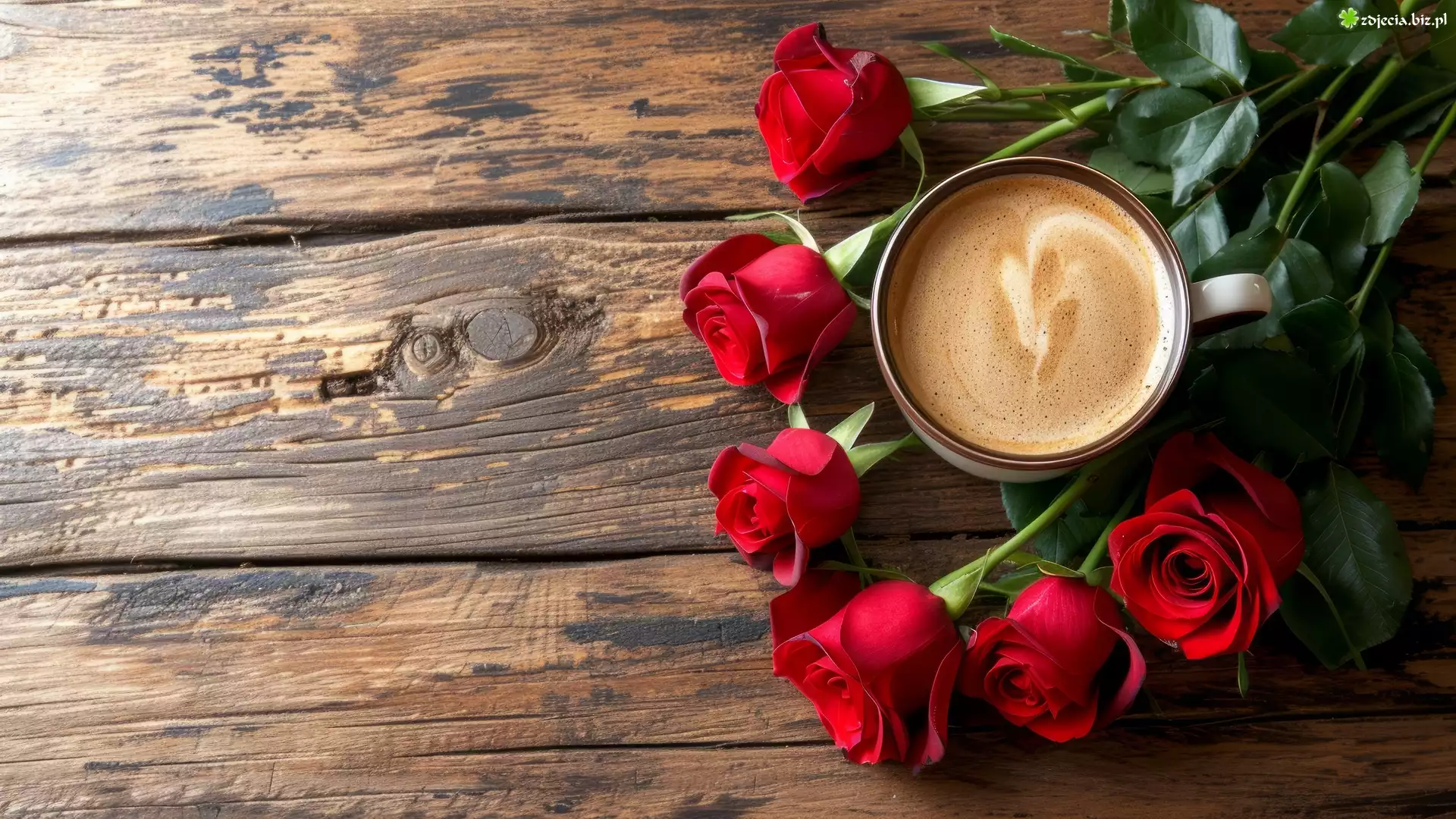 Zdjęcie Kwiaty, Róże, Kawa, Drewno, Deski