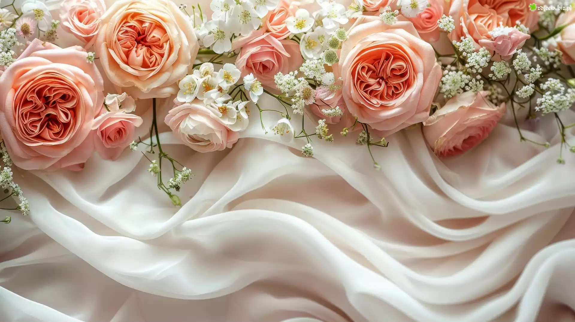 Zdjęcie Białe, Kremowe, Kwiaty, Róże, Tkanina, Kompozycja