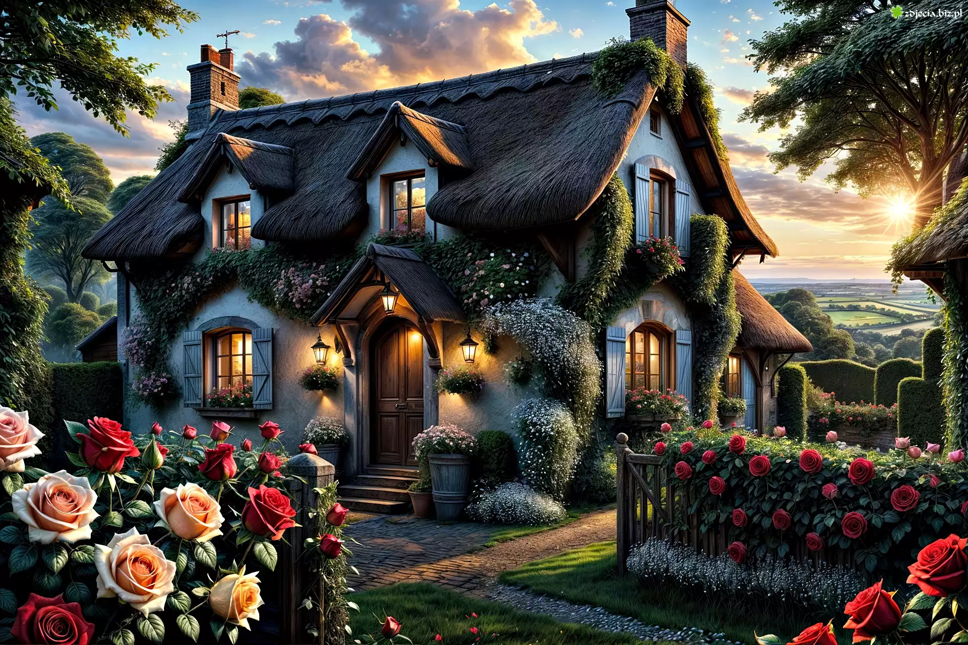 Zdjęcie, Dom, Ogród, Kwiaty, Róże, Promienie słońca, Grafika