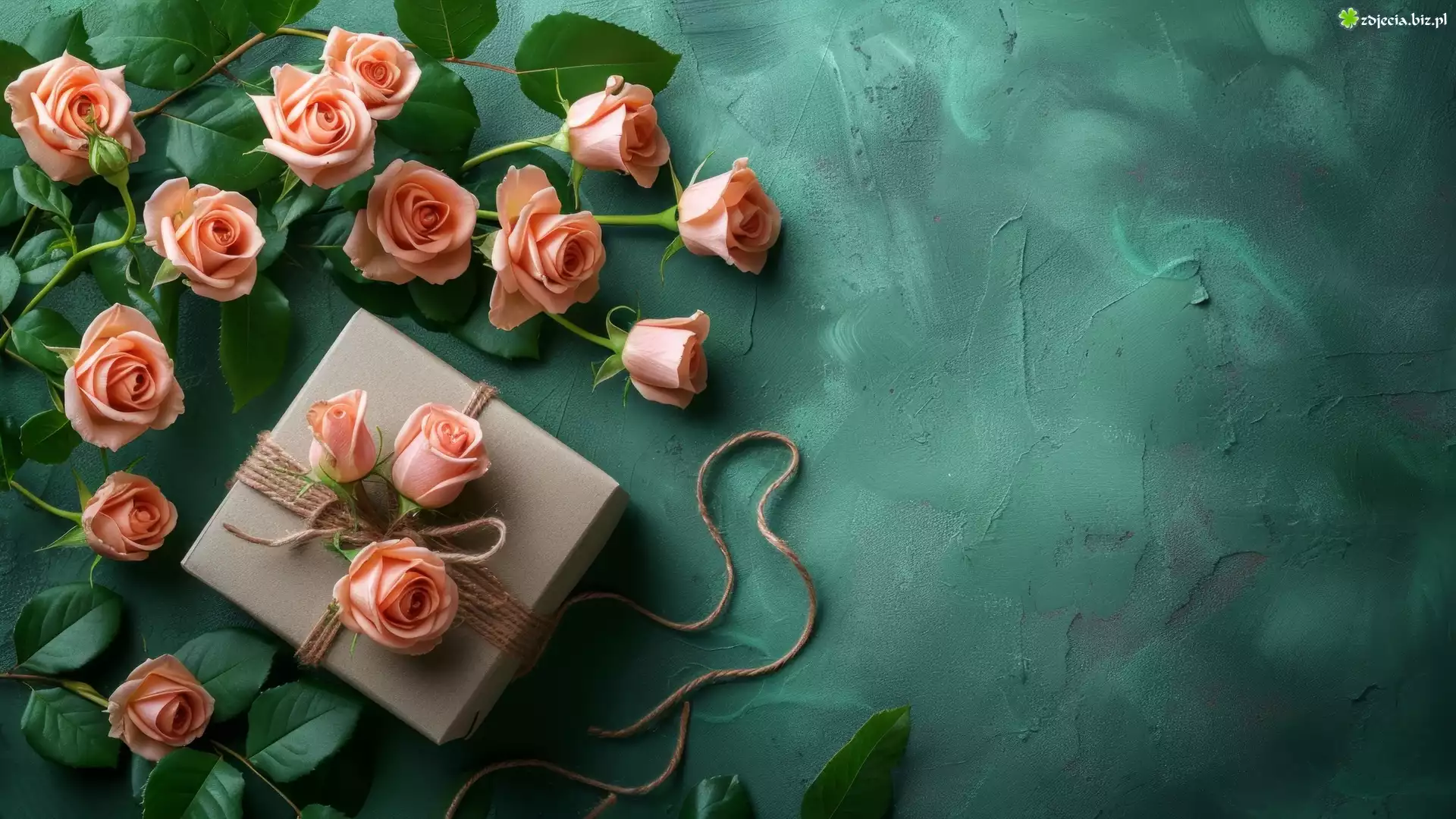 Zdjęcie Kwiat, Róże, Liście, Prezent, Sznurek