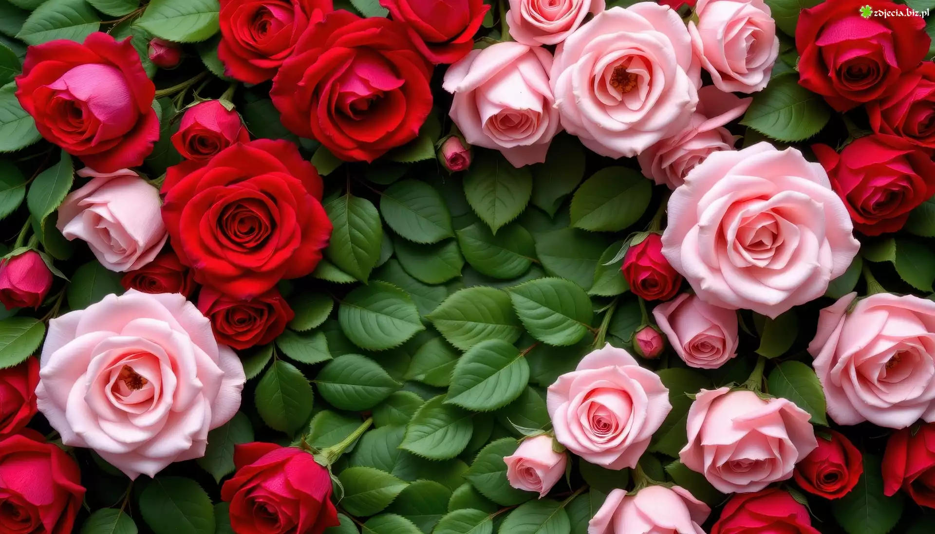 Zdjęcie Kwiaty, Różowe, Czerwone, Róże, Zielone, Listki