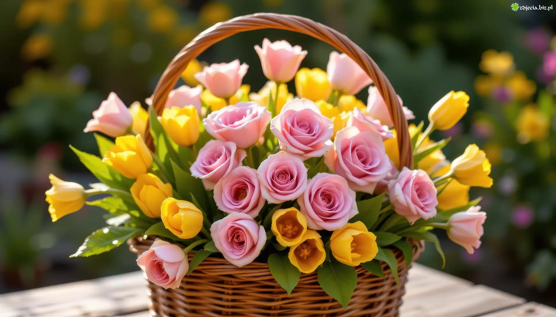 Zdjęcie Żółte, Tulipany, Różowe, Róże, Wiklinowy, Koszyk, Kwiaty