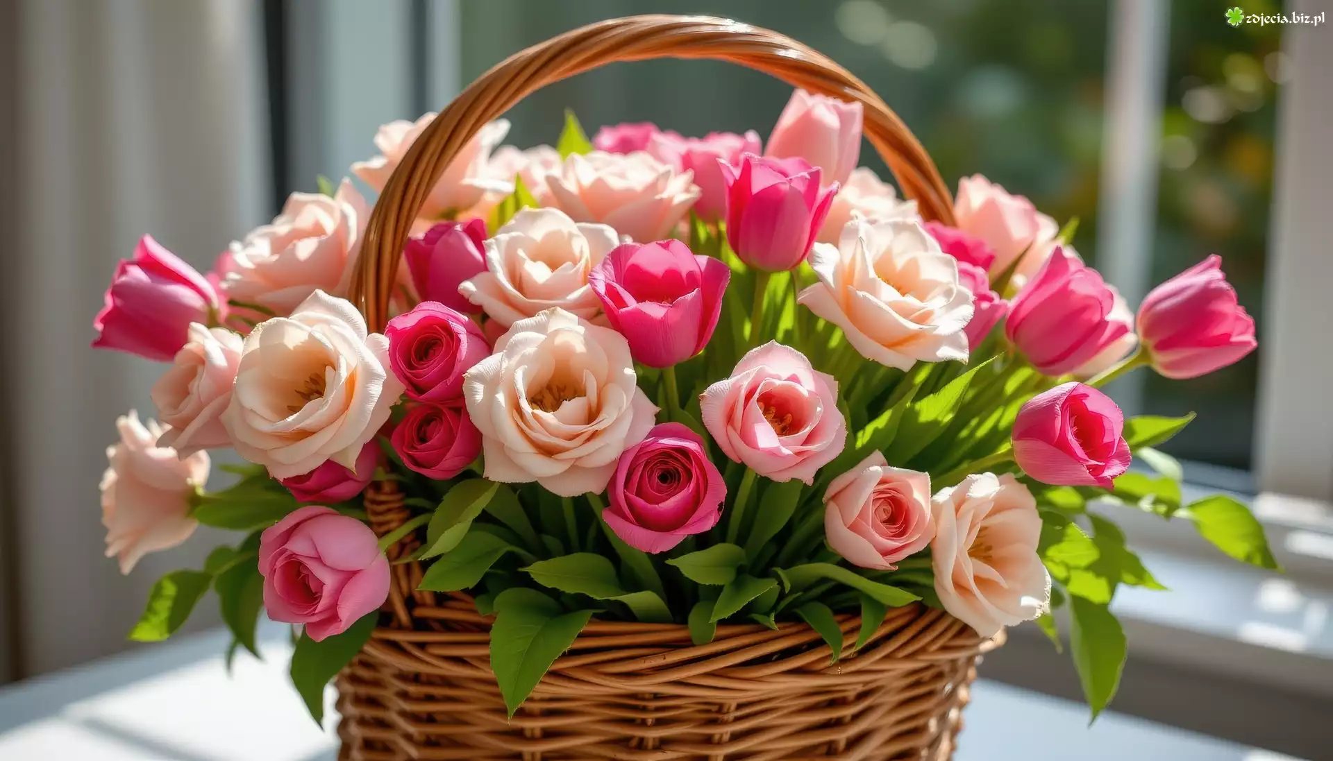 Zdjęcie Kwiaty, Róże, Tulipany, Koszyk, Okno