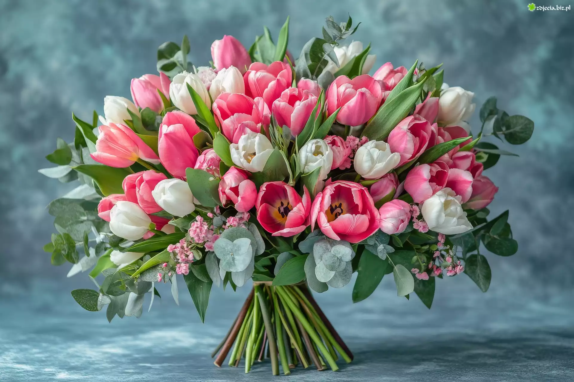 Zdjęcie Bukiet, Różowe, Białe, Tulipany, Listki