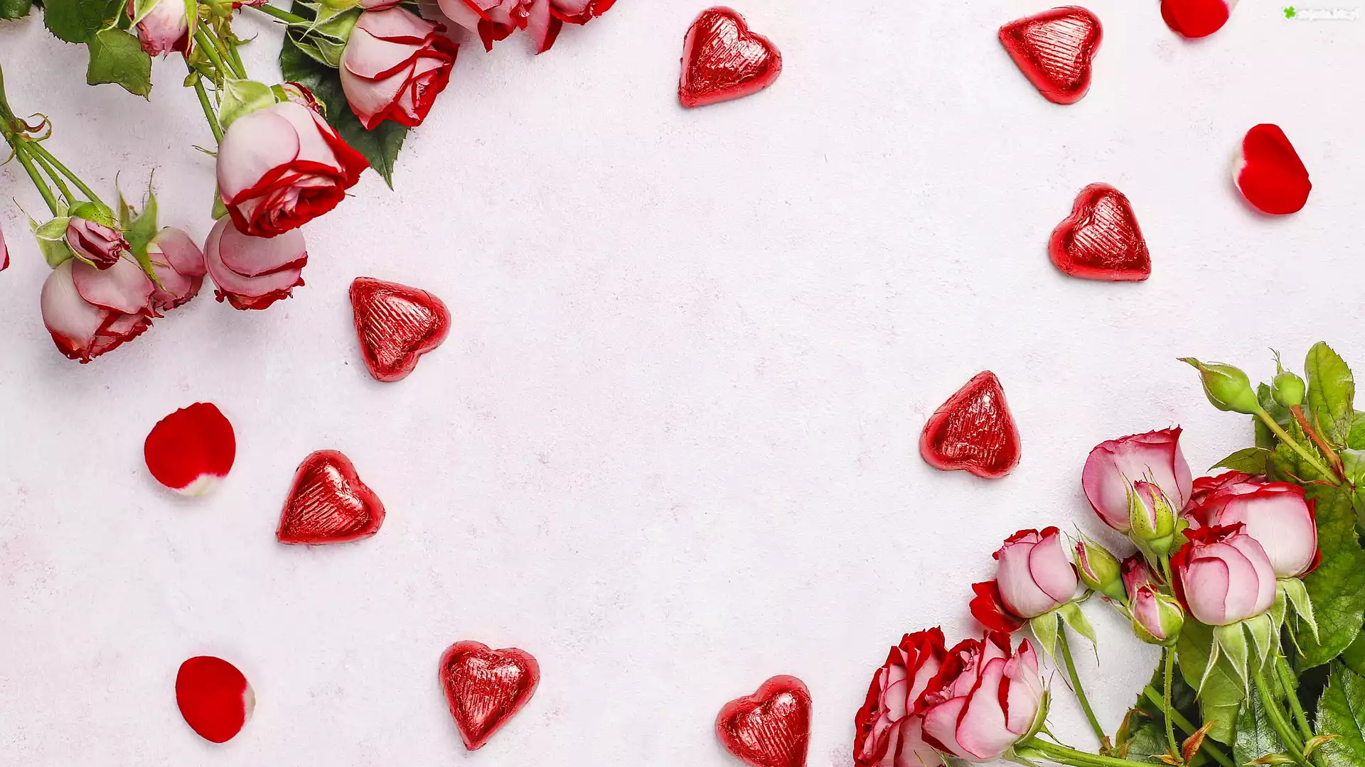 Zdjęcie, Czerwono-różowe, Róże, Pąki, Pralinki, Serduszka, Walentynki