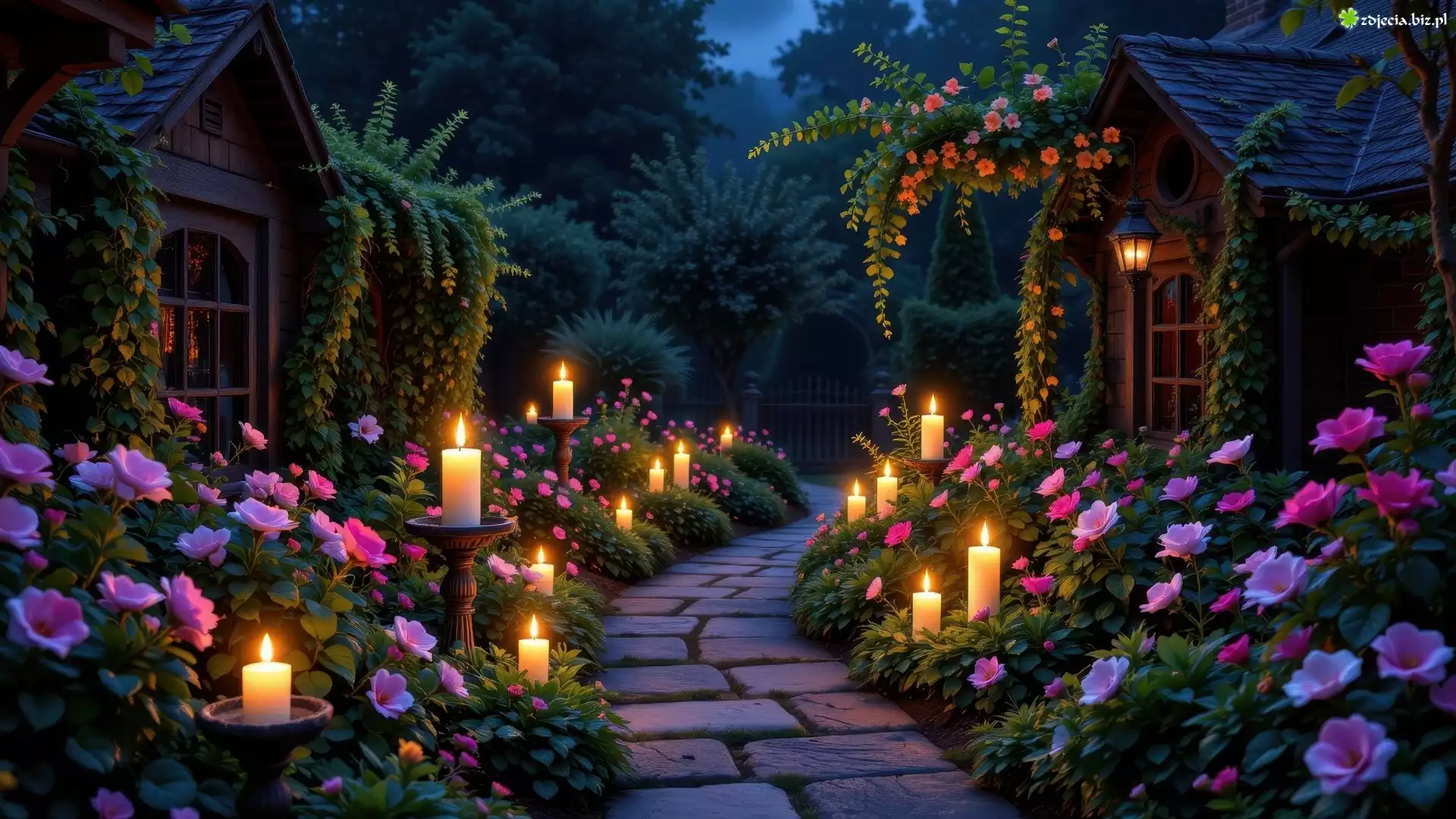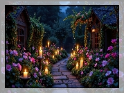 Zdjęcie Ogród, Dwa, Domy, Różowe, Kwiaty, Świece, AI