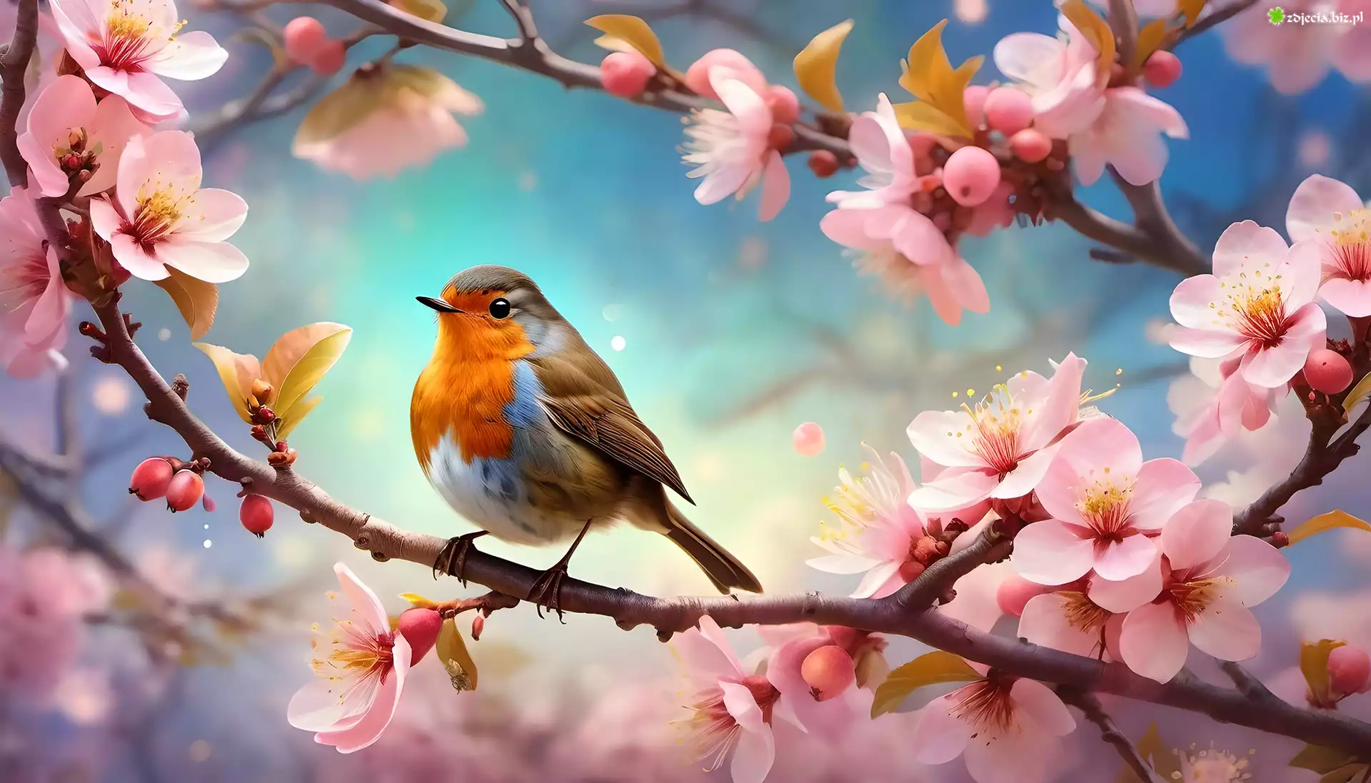 Zdjęcie Rudzik, Ptak, Gałąź, Różowe, Kwiaty, Grafika