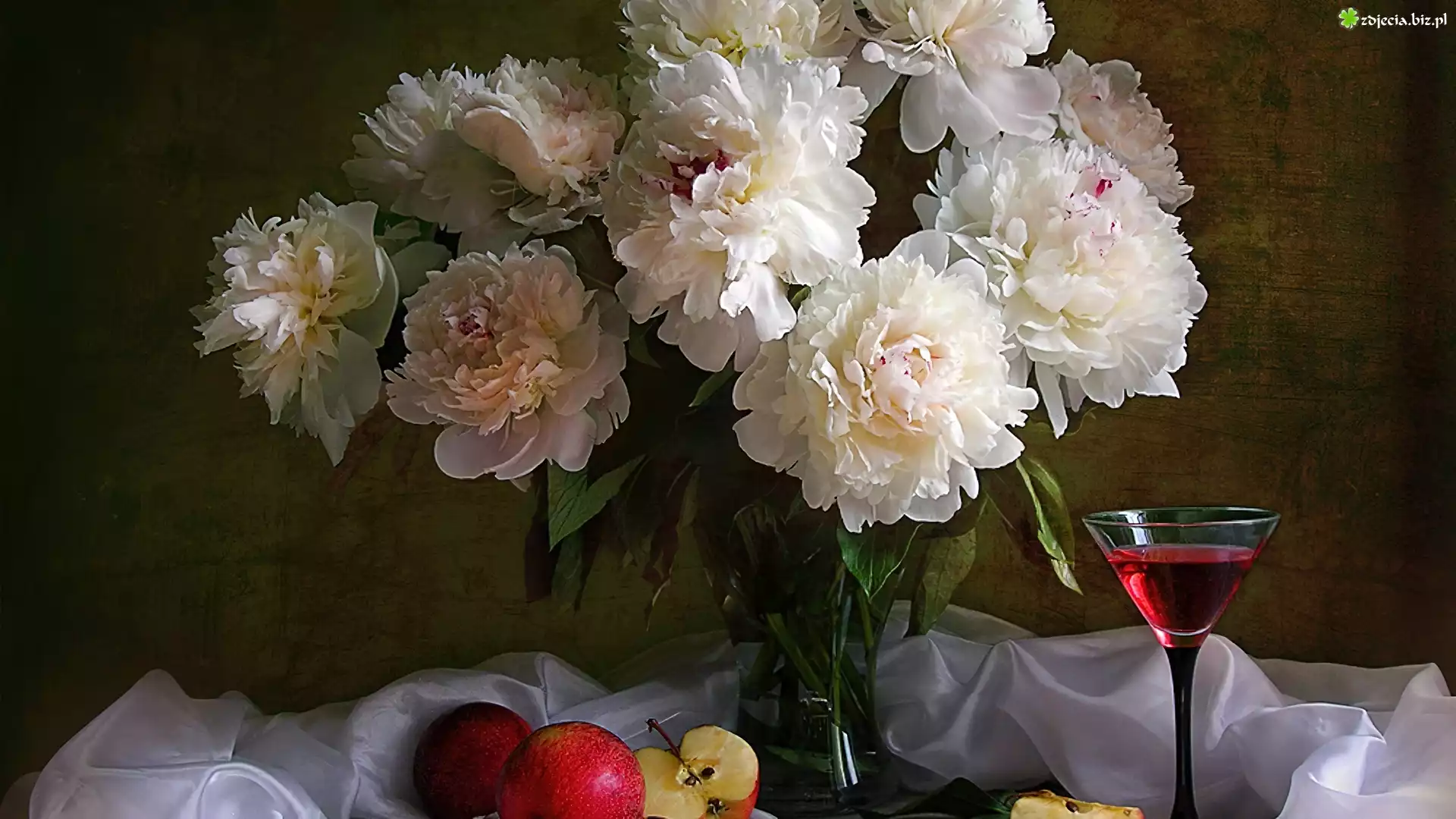 Zdjęcie Różowe, Piwonie, Jabłka, Wino