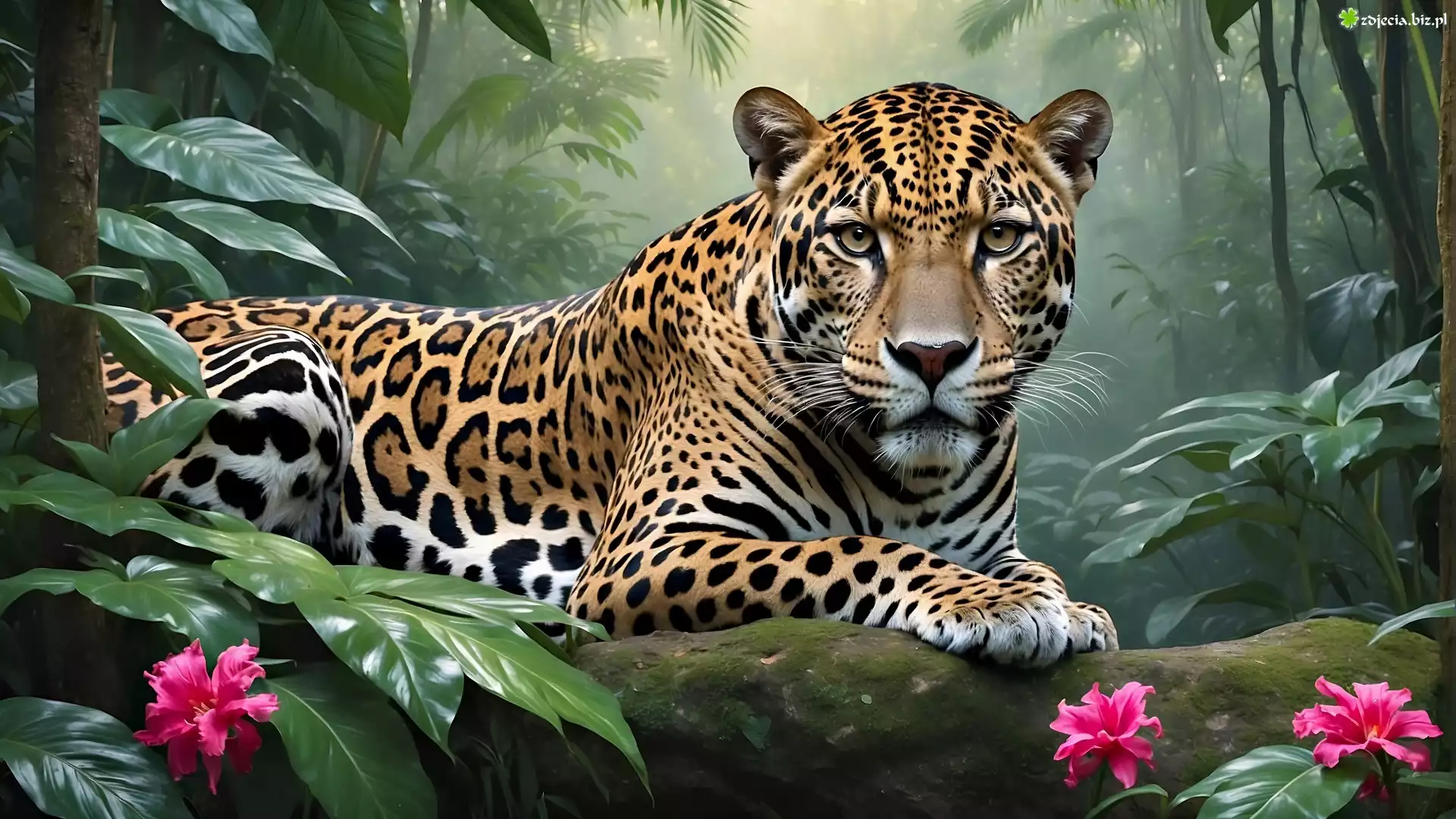 Zdjęcie Leżący, Jaguar, Kłoda, Różowe, Kwiaty, Liście, 2D