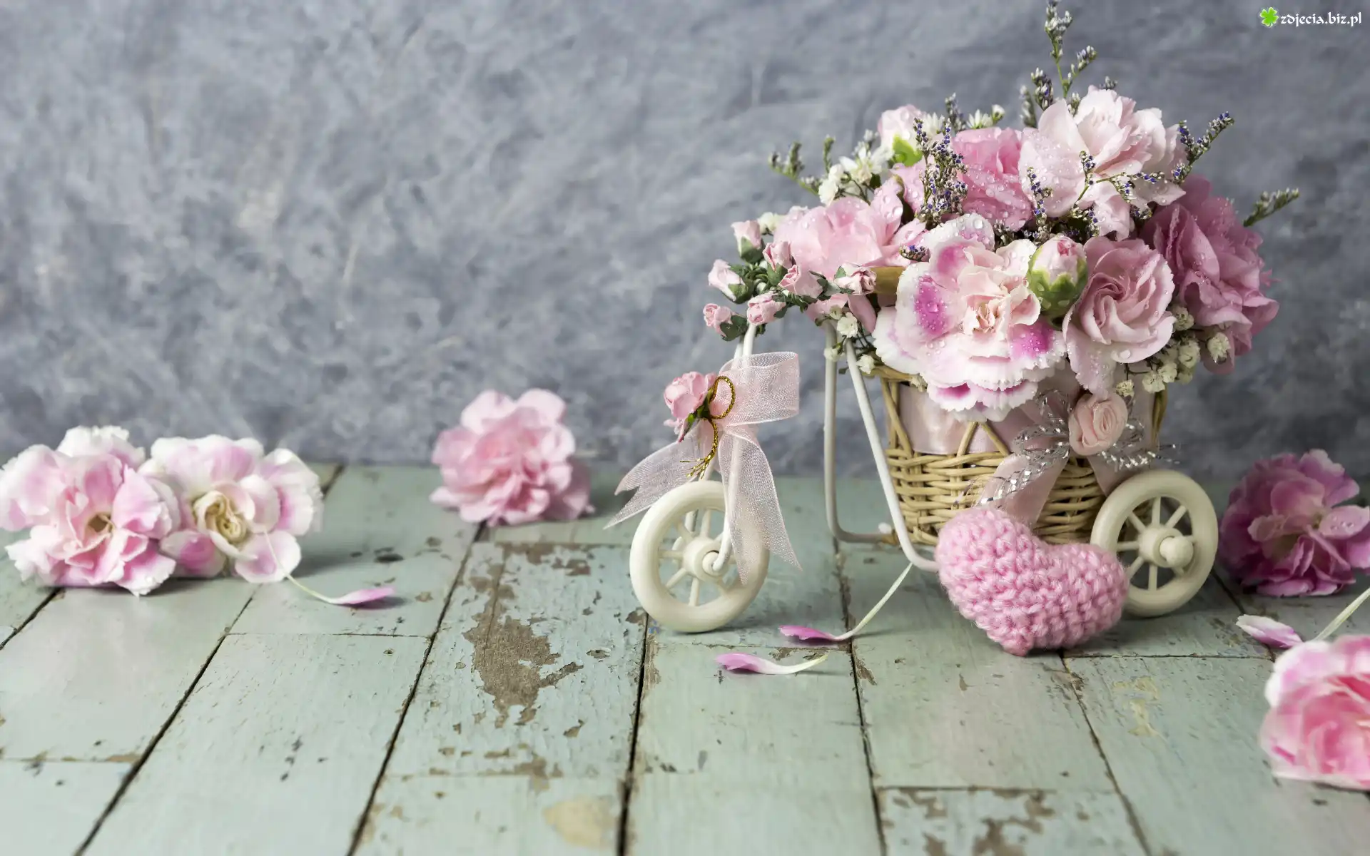 Zdjęcie Kompozycja, Różowe, Kwiaty, Goździki szabo, Rowerek, Serce